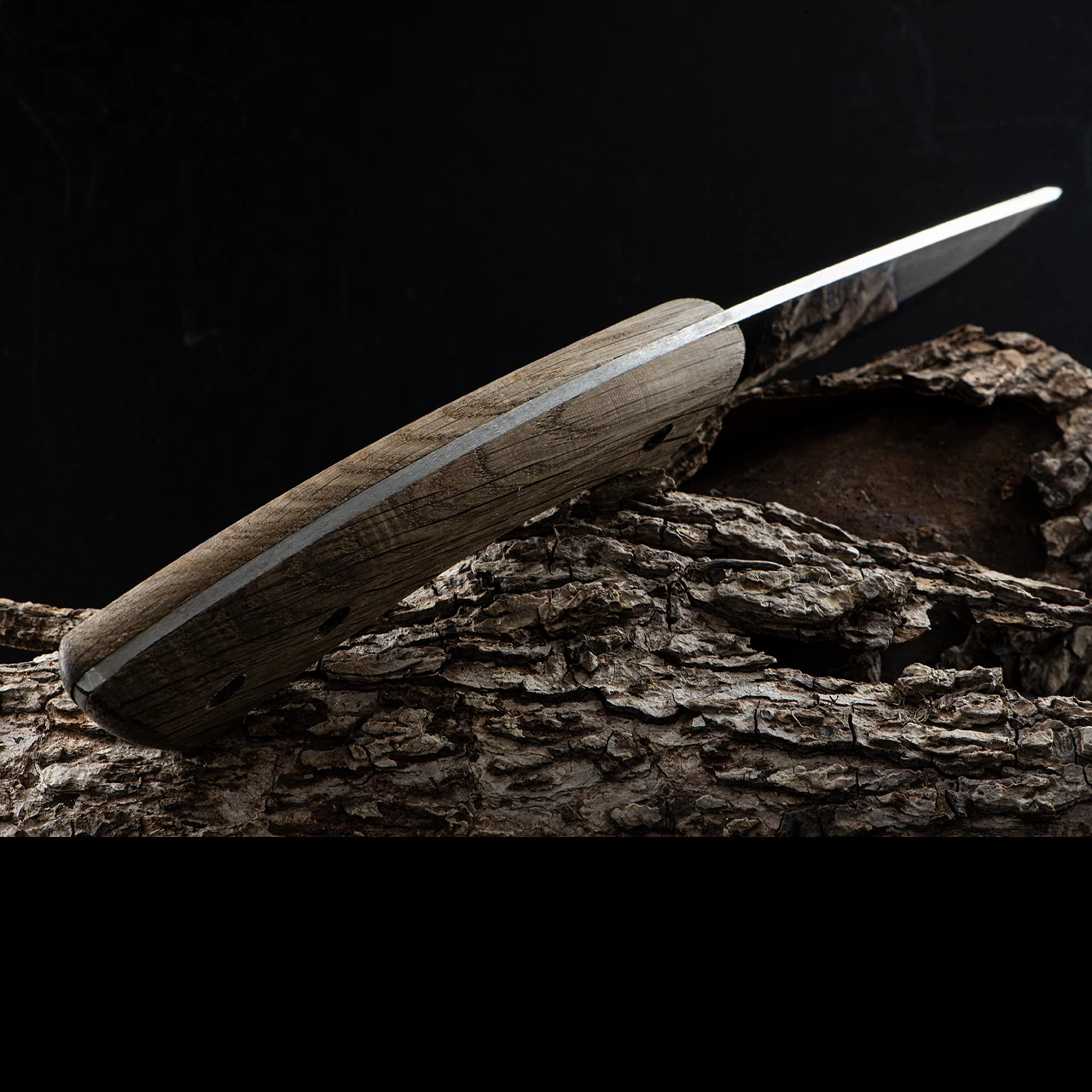 The handle is made from Black Oak which is a hard resillient material perfectly suited to outdoor use. It is supplied with a leather sheath and lanyard.