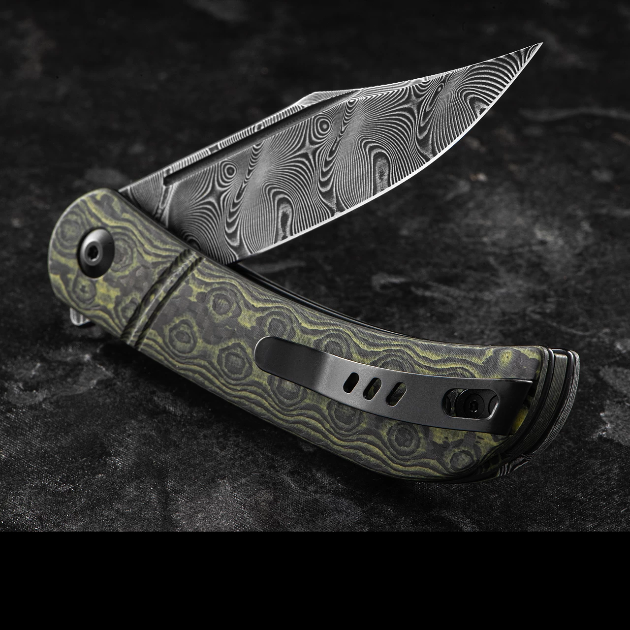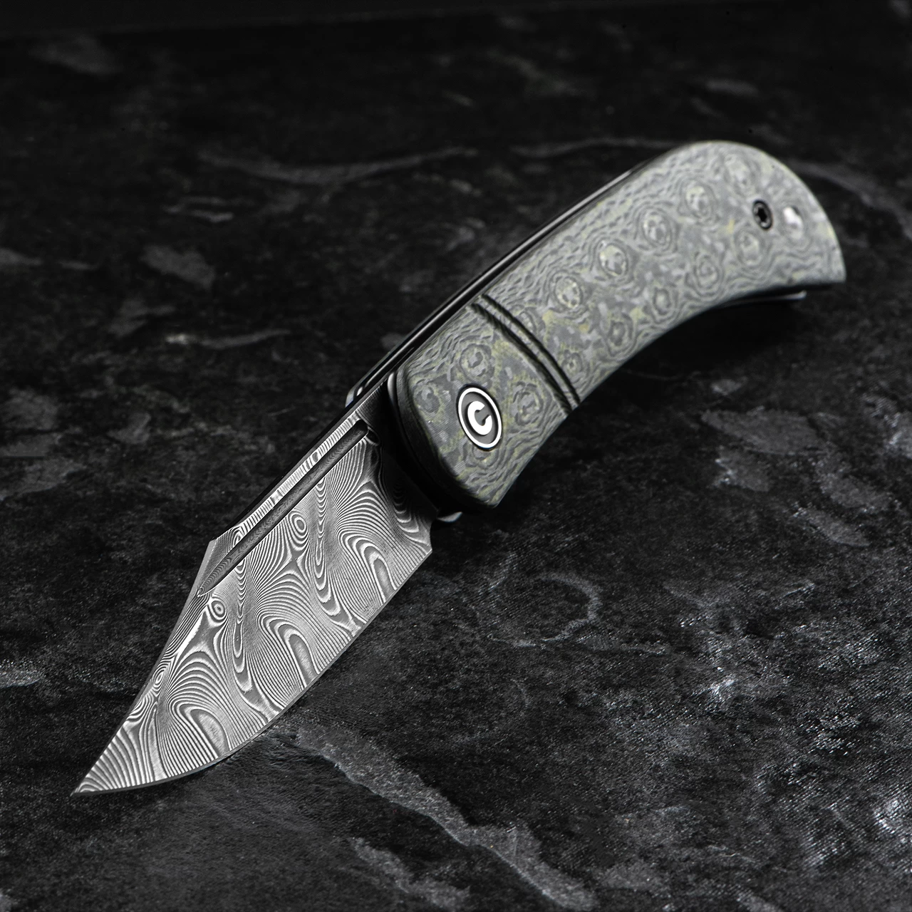 The blade is under 7.6cm (three inches) long and non-locking so can be carried as a constant working companion in the UK. The handle is layered G10 and carbon fibre in a “rose” pattern in a choice of either grey or green. It creates a dramatic and eye catching affect. The blade is equally appealing being made from Damascus steel with a clip point form.Â
