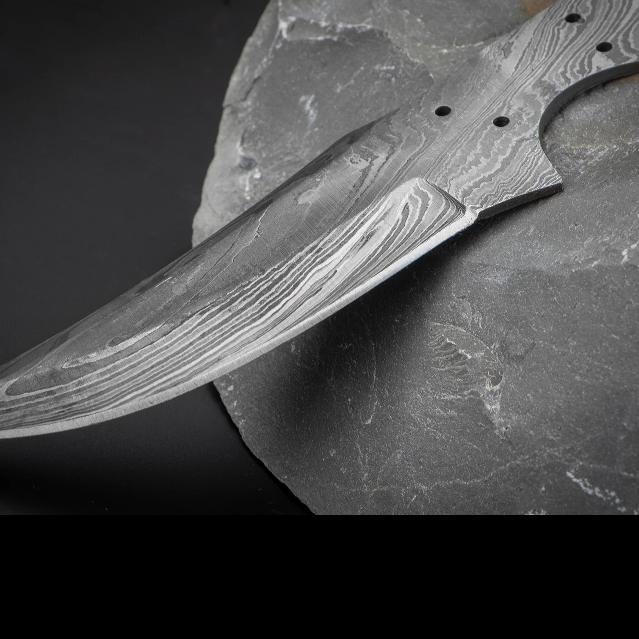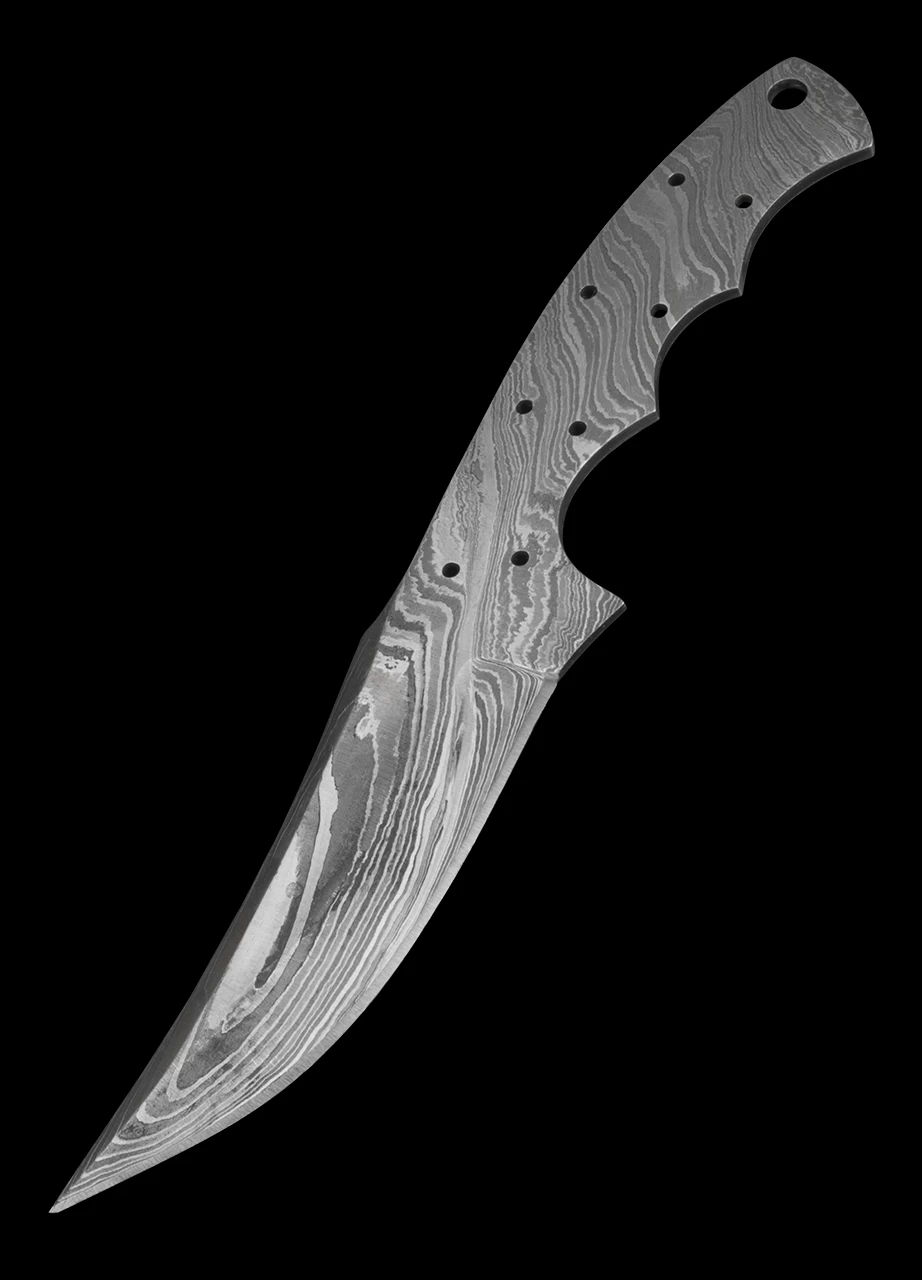 If you’ve ever fancied making your own knife then now is your chance. This blank has a nicely shaped blade with and upswept form. With a bit of imagination with your handle choice you could own a knife of real distinction. The blade material is layered Damascus with a full tang and eight pin holes plus a hole for a lanyard.