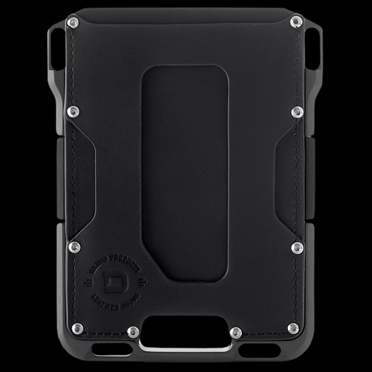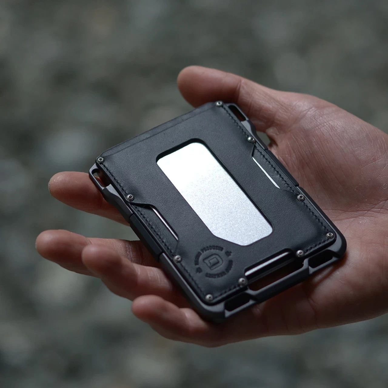The Dango M1 Maverick Wallet Single Pocket Leather combines CNC machined and anodized 6061 aerospace aluminium with top grain leather; a fine mixture of industrial hardware and plush elegance. The chassis has 4 Loop Holes incorporated into each corner to attach keys, lanyards and Tethers for both lefties and righties. The surface of the M1 chassis is anodized slate grey and assembled with Jet Black Leather. The metal RFID blocking card cavity can hold up to 6 cards depending on card thicknesses.