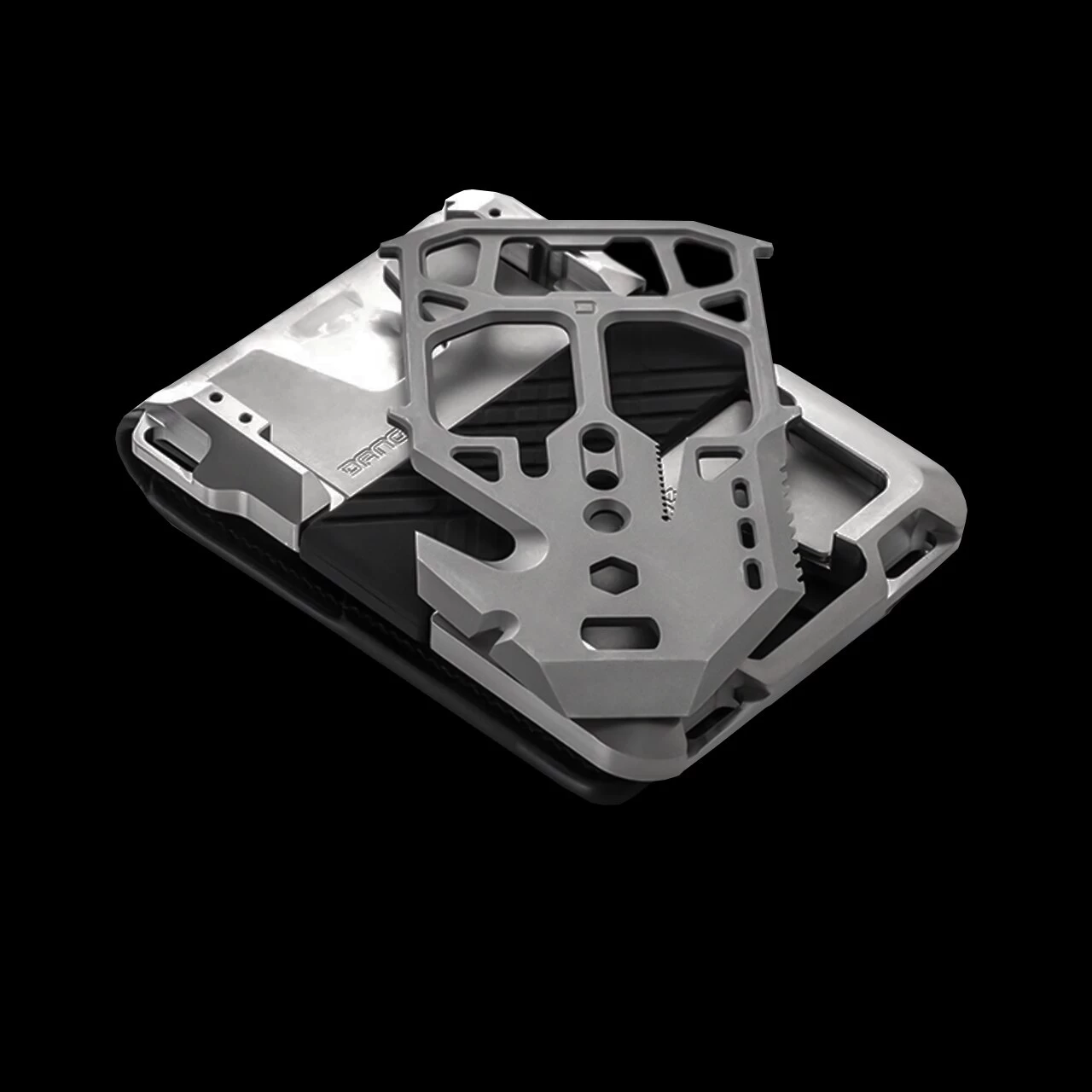 The M1 Titanium Maverick Tactical Wallet comes with the 10-function Dango MT04 multi-tool which slides into the cavity where the cards sit. When engaged, the multi-tool can nest securely into the safety locks built into the wallet chassis- allowing for easy sawing, cutting and protection. Common tools are built in: bottle opener, paracord cutter, rope tensioner, nail pryer, a serrated/sharpened edge and even a belt cutter and oxygen wrench which is perfect for survivalists. Dango thought of everything and think you will be pleased with all of the functions built into a compact package.