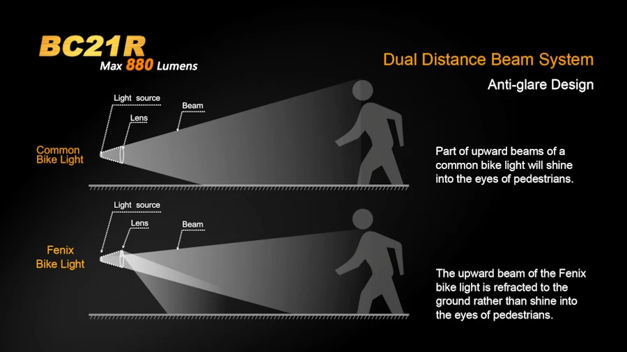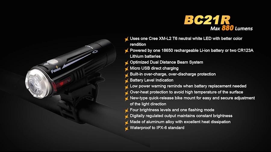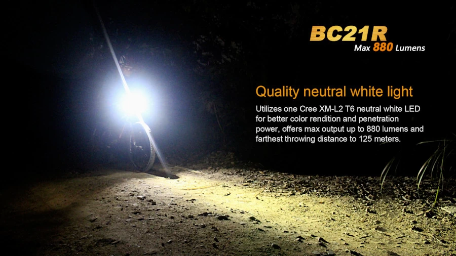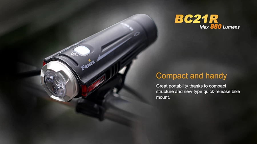 Featuring a quick release mount, removable rechargeable battery (Fenix ARB-L2 2300 mAh 18650 cell) and USB charging lead, the 880 lumen Fenix BC21R bike light offers great performance and versatility in a compact high quality package. The removable battery means that a spare can be carried for longer rides if needed and the cell can be replaced at any time.