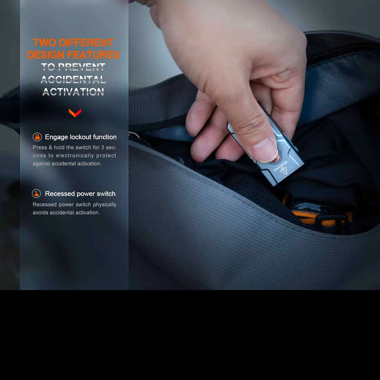 In addition to the white outputs, the torch features a red mode for preserving night vision and emergency use. To prevent accidental activation the E03R V2.0 has a lockout mode and a recessed power switch. Surrounding the power button is a breathing light which glows red and green to alert other road users of your presence.
