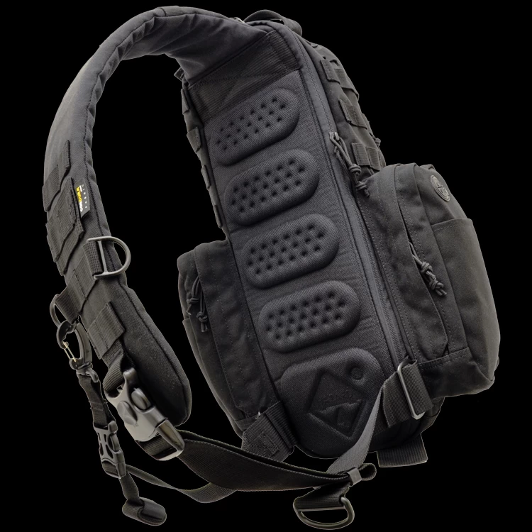 Being jammed in confined spaces for hours is an unfortunate part of the business for many professionals. Whether it’s a military unit in an a.p.c., a pilot in a cockpit, drivers in a HumVee, or a journalist in the back of a goat truck, they all have to bring their gear. And they all may need to ‘relocate’ in a hurry. This is the environment for which the Hazard4 Evac line of sling packs has been geared. They are slim shaped to be easily manoeuvred in crowds, or stored in vehicles/lockers, and are quick to take on or off. They are also ambidextrous, and unlike others in this class, are actually comfortable on the shoulder; The bottom strap clips from either the right or left lower corner and the padded section realigns itself ergonomically in the correct body-hugging direction. The bag can be rotated to the chest for on-the-go access, and all pockets are designed to face the user in this mode on either the right or left side. One-strap-carry also makes shouldering a long-gun comfortable – unlike a backpack.