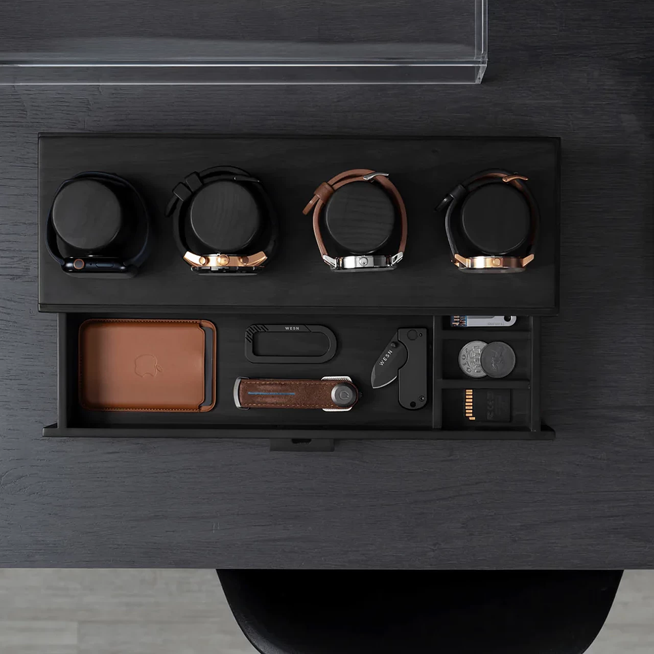 Holme and Hadfield have kept the functional features of a traditional watch organizer and valet tray, while combining it with a modern style case to display your favourite watches in a unique way.