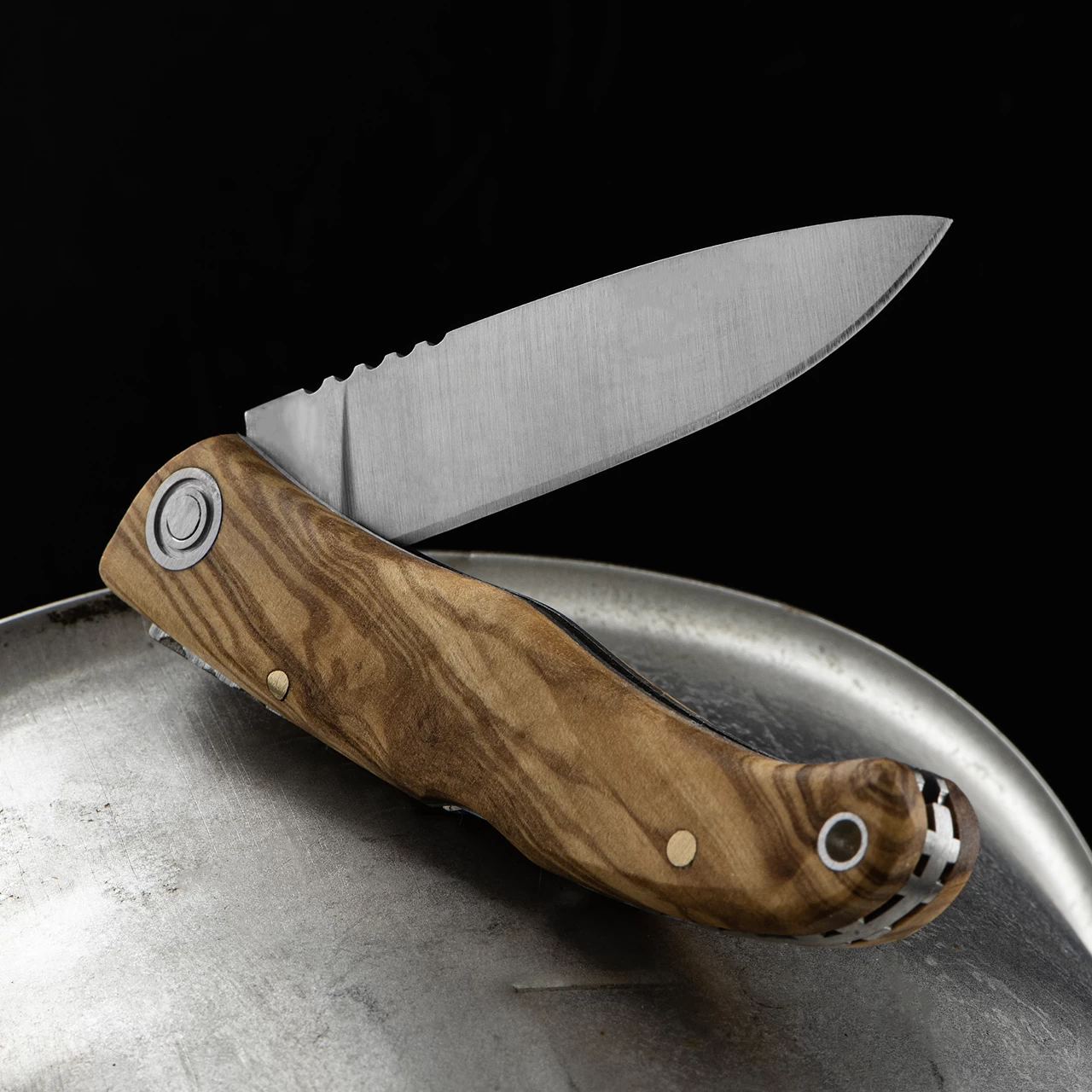 Manufactured in Spain it has a 4116 stainless steel blade that locks into place with a secure back lock and a very attractive Olive wood handle with stainless liners. A nice touch that also catches the eye is the file worked back spine.