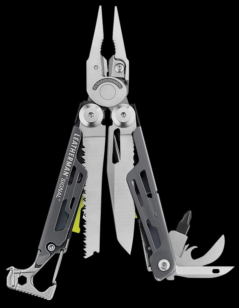 Lose yourself in the outdoors. In the Leatherman Signal, Leatherman’s traditional functional tools like pliers, saw, can and bottle opener, awl, a variety of hex and Leatherman bit drivers, and combo knife blade pair with new preparedness features like a shaped diamond coated sharpener for maintaining your straight and serrated blade, fire-starting ferro rod, and an emergency whistle. Stay ready for the expected (and unexpected) no matter where you are with everything you need right on your belt.