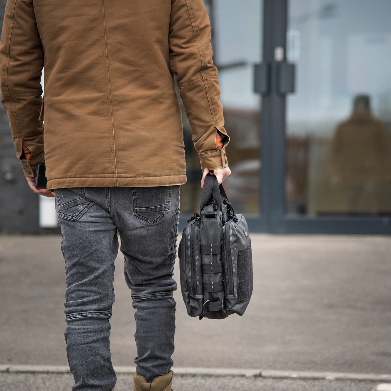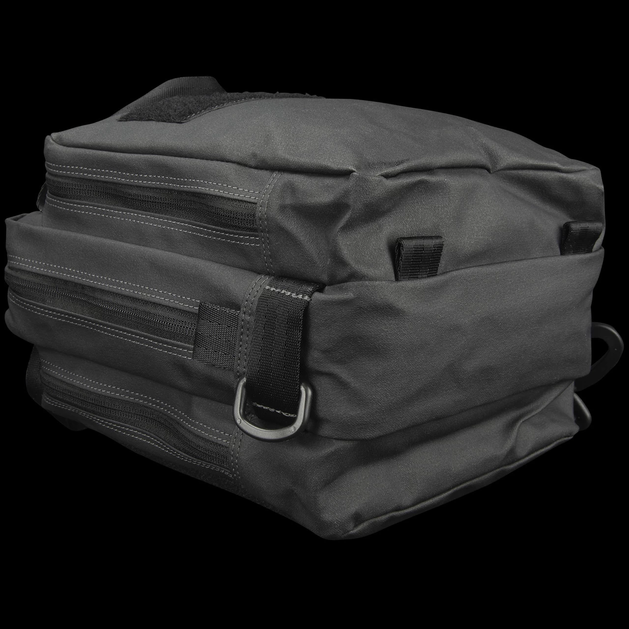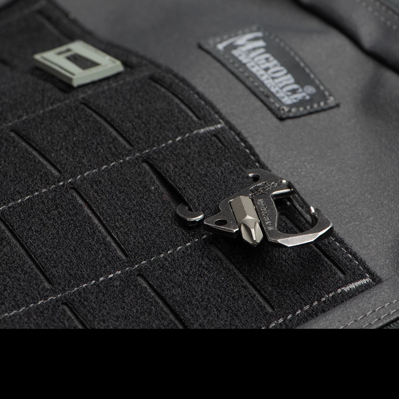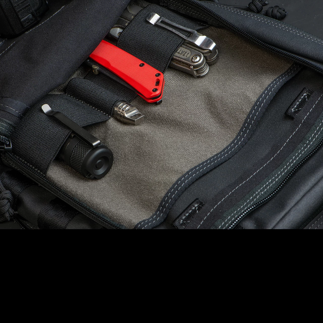 The main section has both sides as a hook and loop surface to add pouches and pockets to organise your stuff one of which is zippered. One outer has a MOLLE panel to attach your carabiners and tusk tools with an inner for books and keys. The other side has four elasticated loops for your flashlight, knife or multi-tool
