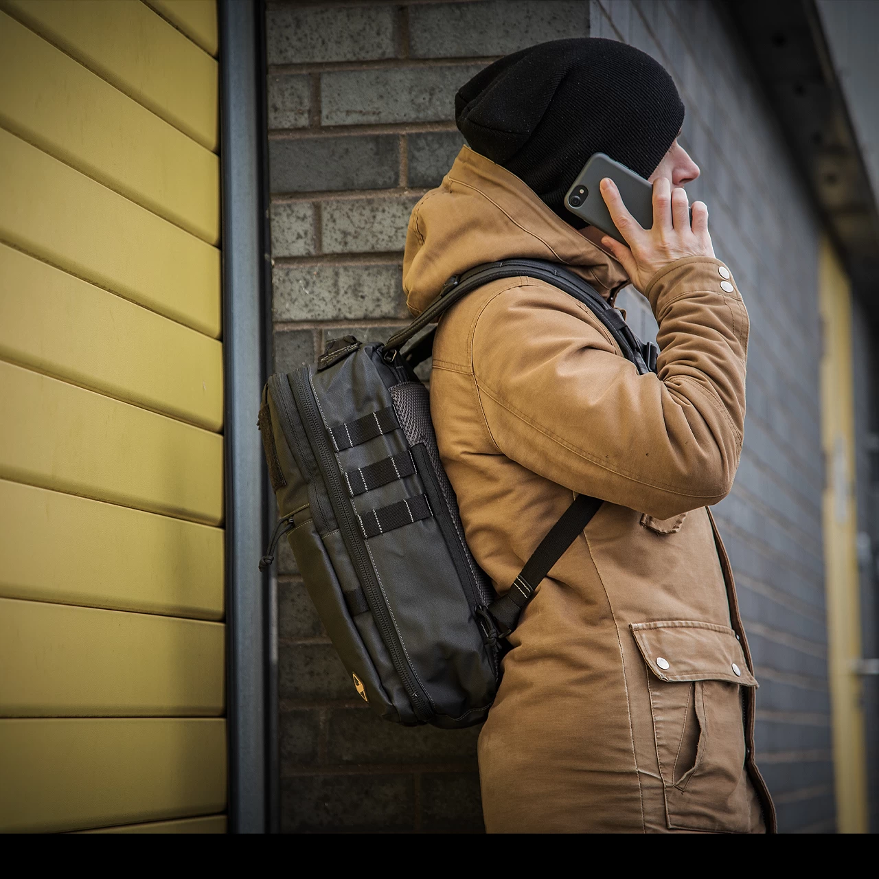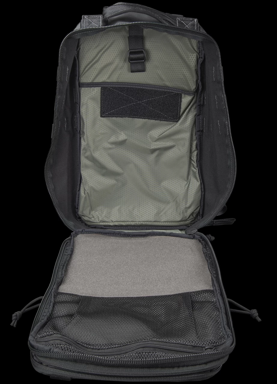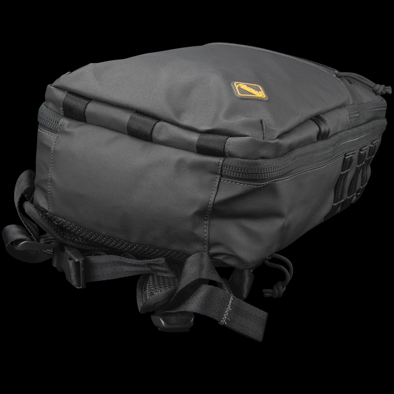The 500 Denier material is waterproof and extremely tough. The slimline but roomy interior is perfectly suited to books, folders and a laptop/iPad (the rear section is padded to protect fragile items). The main compartment features a zippered web pocket, a section to add pouches and pockets and a large sleeve for you iPad. The front section has one large surface for added modular pockets and loops and opens flat to access your EDC items. There is also a front zippered pocket for keys, wallet and vital documents.