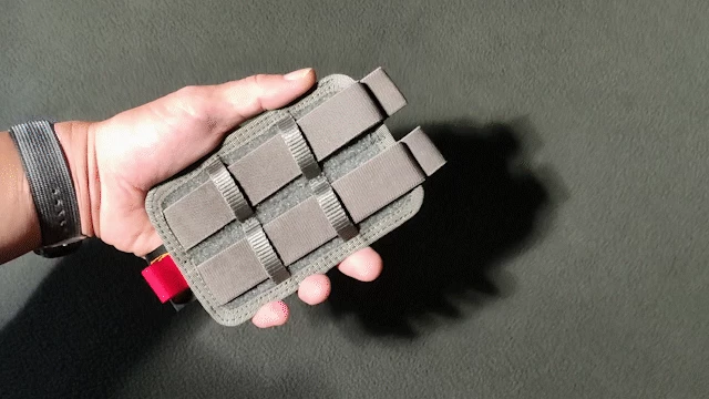 The mounting base attaches to a belt or back with MOLLE loops. On the opposite side of the MOLLE is a small strip of hook-field, which holds the main pouch loosely in place. The pinch-clip webbing holds the pouch securely. Inside the pouch is the grey adjustable organiser plate which is held in the pouch with hook-and-loop field. The other side of the pouch has elasticated webbing which can be adjusted to hold items of your EDC.