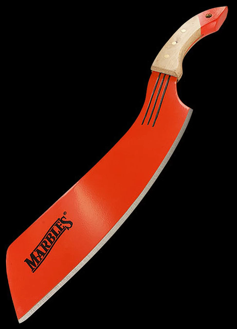 The Marbles Parang has a 13¾” carbon steel parang blade with orange coating. Natural wood handle with lanyard hole.