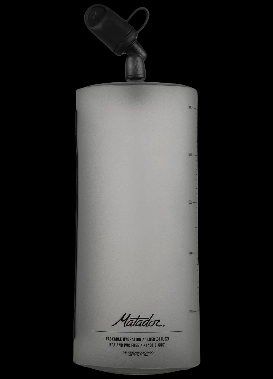 The Matador Packable Water Bottle is designed to stay by your side from the airport to the mountains, without taking up unnecessary space. The full length straw allows for upright drinking, while the locking bite valve prevents leaks. The minimal design and flexible TPU allows the bottle to fold down flat when not in use. 1 litre capacity.
