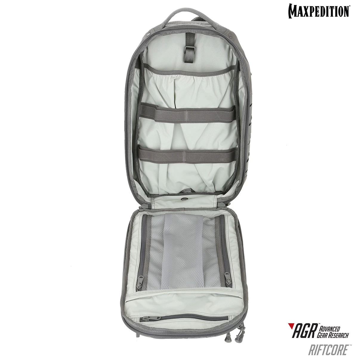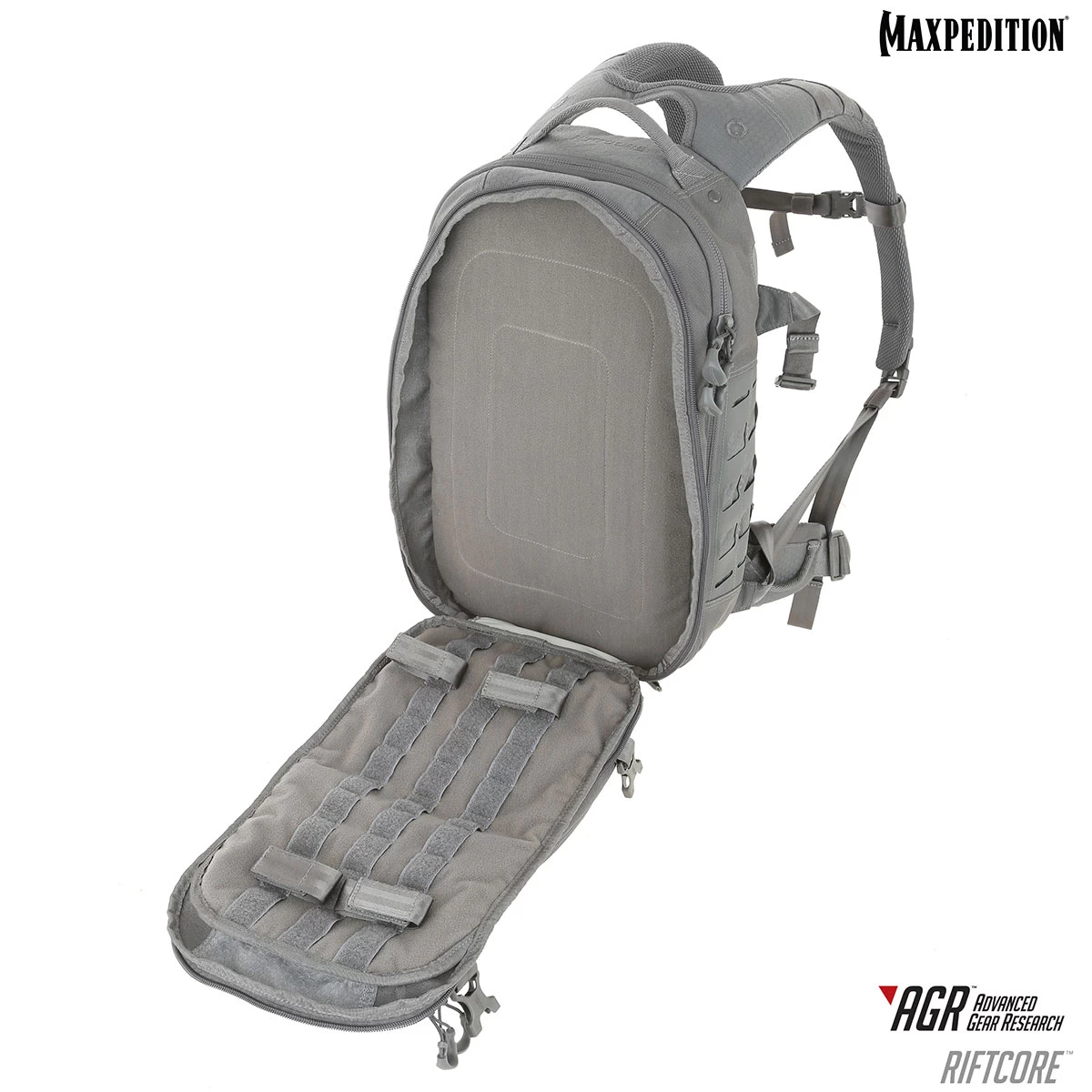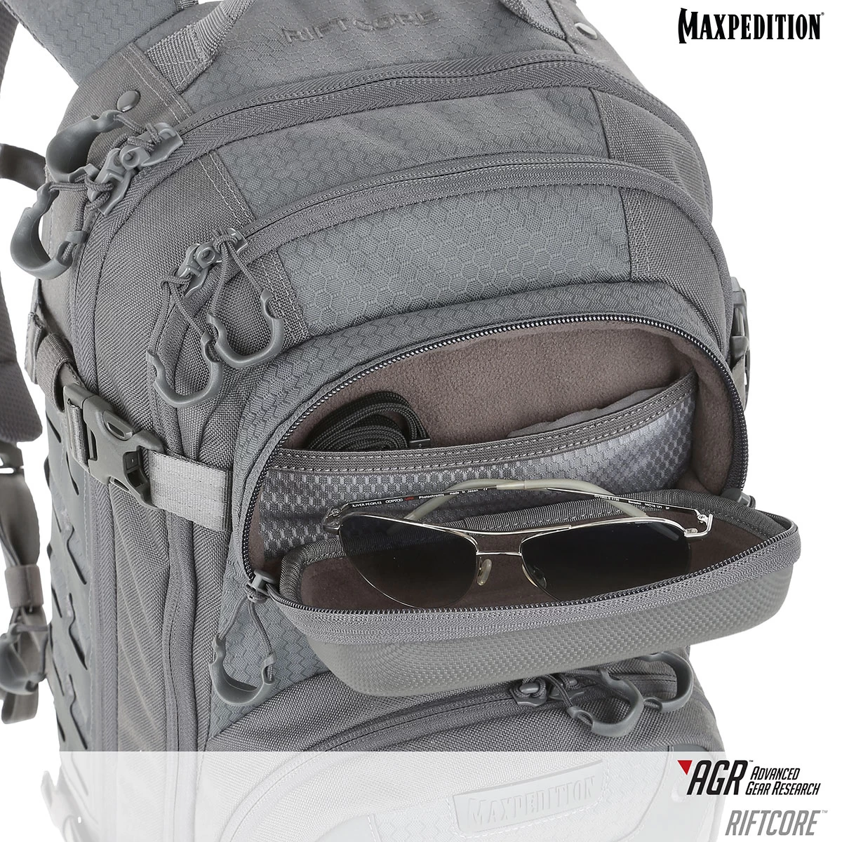 The Maxpedition RIFTCORE Backpack is an ergonomic pack with quick release yoke-style straps. It is equipped with two locations for CCW placement, including a fully loop-lined rear compartment with two-way access. The middle compartment, which has a full clamshell opening, comes with multiple loop-lined adjustable straps that can be repositioned to make organizing and locating contents much easier. The semi-rigid fleece-lined EVA pocket on the front of the pack is ideal for storing sunglasses, electronics, or valuables.