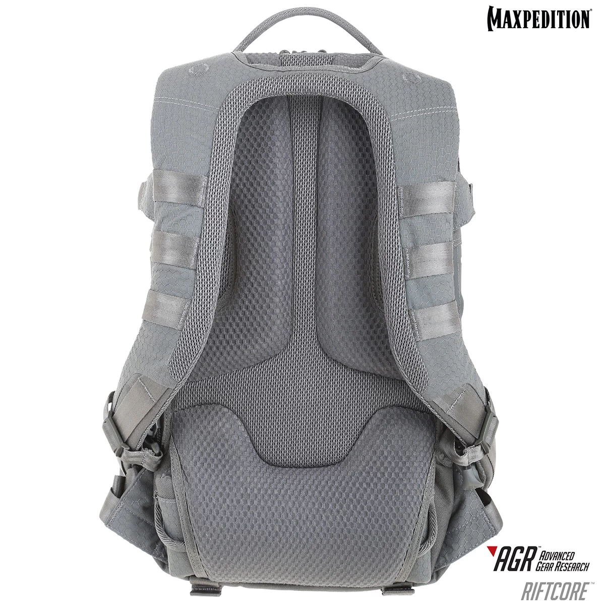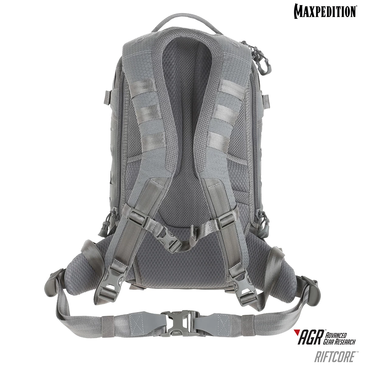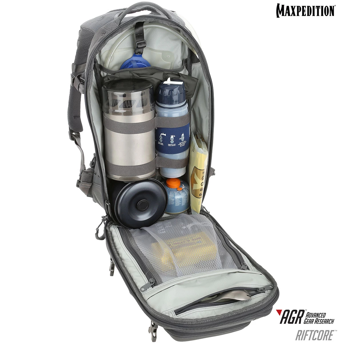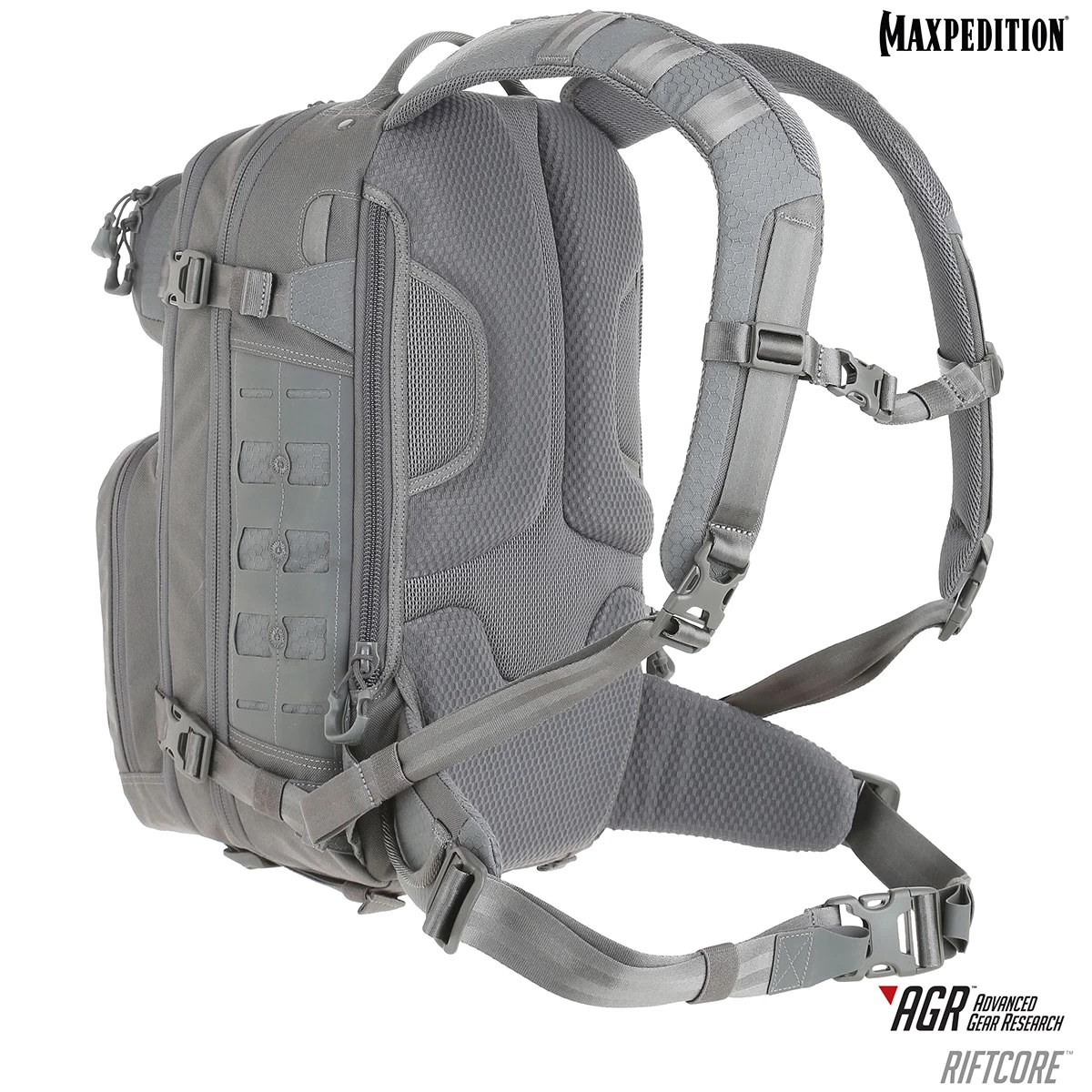 The Maxpedition RIFTCORE Backpack is an ergonomic pack with quick release yoke-style straps. It is equipped with two locations for CCW placement, including a fully loop-lined rear compartment with two-way access. The middle compartment, which has a full clamshell opening, comes with multiple loop-lined adjustable straps that can be repositioned to make organizing and locating contents much easier. The semi-rigid fleece-lined EVA pocket on the front of the pack is ideal for storing sunglasses, electronics, or valuables.