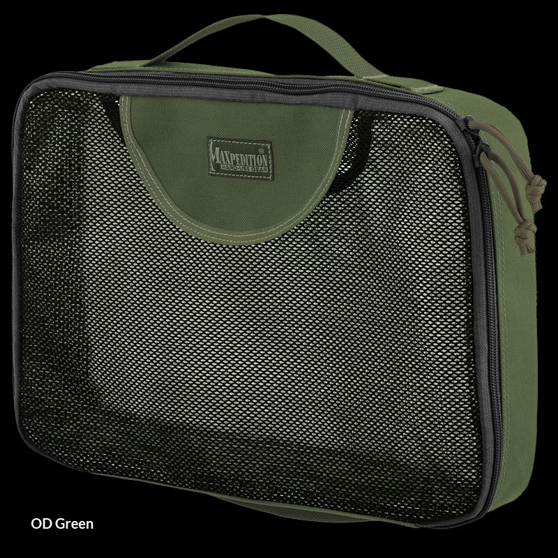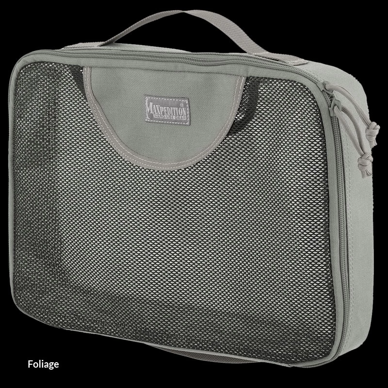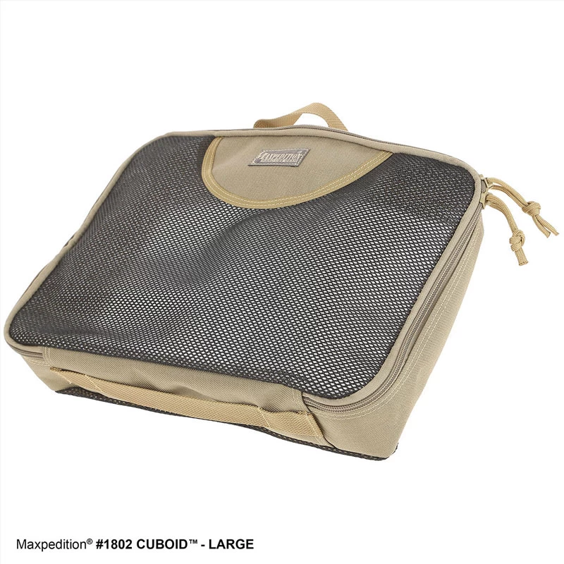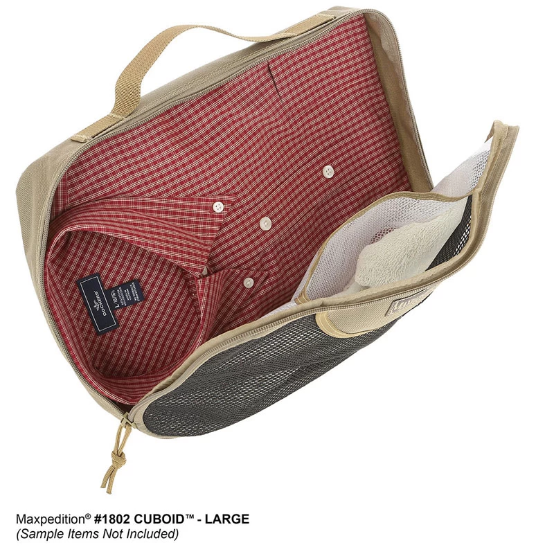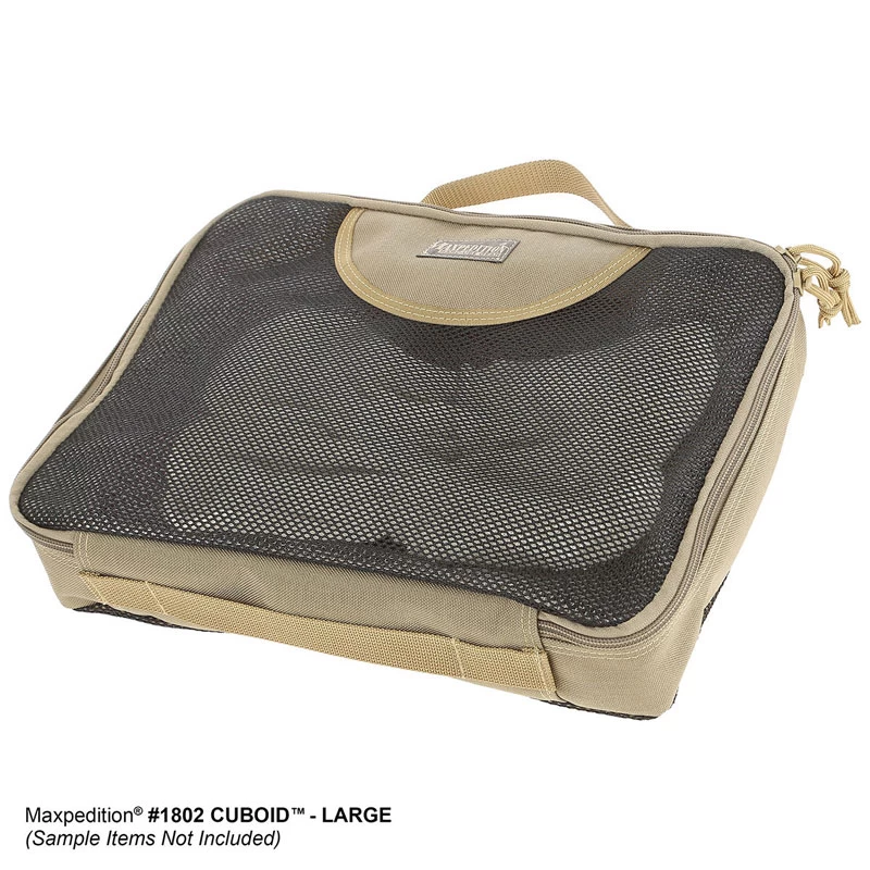 Cuboid organizers are soft containers excellent for travel and ideal for items that dont wrinkle when folded or rolled. Their mesh areas allow viewing of contents. They are specd to fit within each other. Two Medium CUBOID will fit into one Large CUBOID. Two Small CUBOID will fit into one Medium CUBOID. When not in use, they can be stored within each other to save closet space. Overall size: 14 x 10 x 3in Empty weight: 4.3 oz Colors: Black / OD Green / Khaki / Digital Foliage Camo
