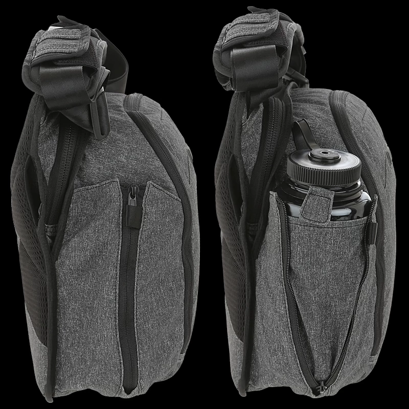 Available in two sizes, this is the Maxpedition Entity Crossbody Bag Small 9L, the smaller 9L / 550 cu. in. version with the signature expandable bottle holder and a quick access rear compartment. The Entity line focuses on a sleek, modern exterior devoid of characteristics typically associated with the “tactical look” which masks an interior optimized for organization and situational readiness.