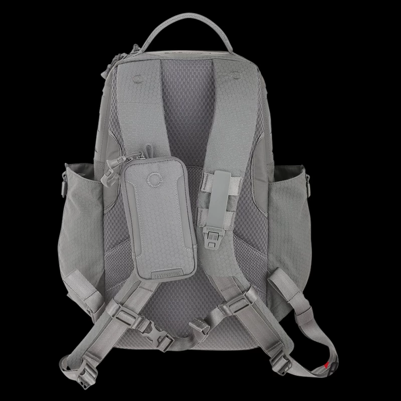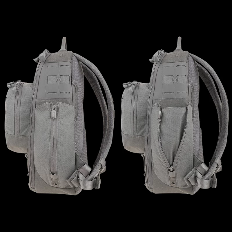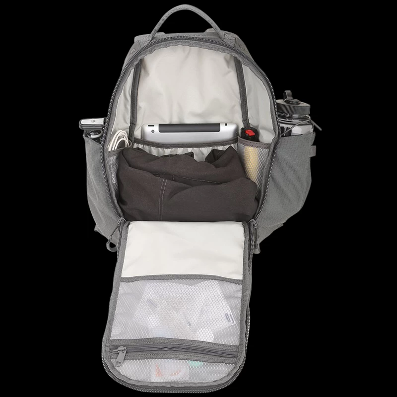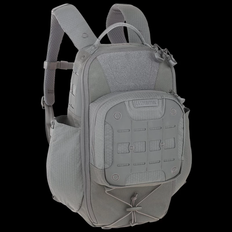 The Maxpedition Lithvore is an ergonomic backpack with padded shoulder straps. There is a top loop field for patch adhesion, a front admin pocket for added organization, a bottom shock cord retention array, two expandable bottle pockets with dual zipper garages, and a fully opening main compartment.