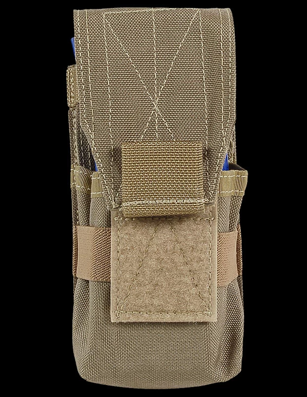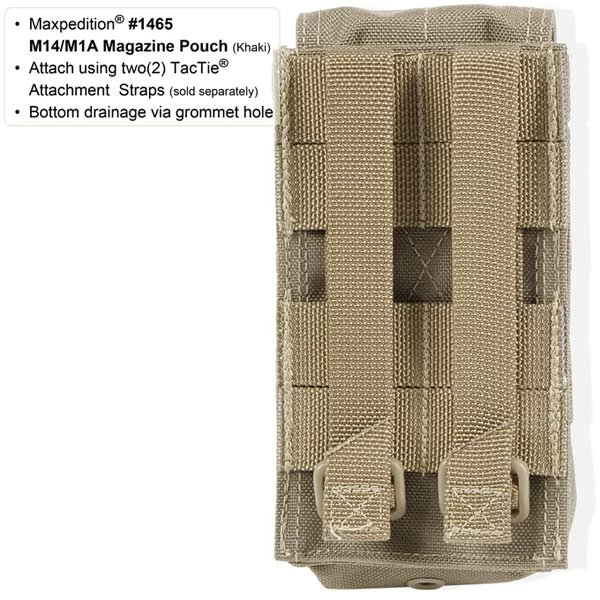 Designed to hold two(2) 7.62 (.308) 20rnd magazines. Suitable for M14, M1A, SR-25, FAL, SCAR-H, or G3 rifles. Fits regular mags or mags with Magpul’s installed. Cover flap is both adjustable & detachable. Dimensions: 7″ high x 3″ wide x 2″ thick Lateral elastic retention allows pouch to be used without lid Oversized 1.5″ webbing pull tab for lightning fast opening Bottom drainage via grommet hole Alternative use: Fits two(2) M4/M16/AR15 mags or radio Attach using two(2) 5″ TacTie Attachment Straps (sold separately) 1000-Denier water and abrasion resistant light-weight ballistic nylon fabric Teflon fabric protector for grime resistance and easy maintenance Triple polyurethane coated for water resistance High tensile strength nylon webbing High tensile strength composite nylon thread (stronger than ordinary industry standard nylon thread) Internal seams taped and finished Stress points double stitched, Bartacked or “Box-and-X” stitched for added strength