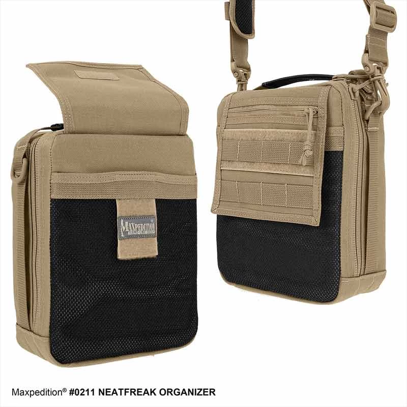 The Maxpedition NeatFreak is the ultimate drop-in gear organizer. The spacious main compartment has thirteen built-in pockets, with a Velcro divider that has three additional pockets. The Velcro divider can accommodate the Hook & Loop Modular Accessories. The front of the NeatFreak is a web pocket, with a fold-over lid that has an additional zippered pocket plus two rows of PALS webbing for attachment of a Maxpedition pocket or sheaths for increased carry capacity. In the back, there is an additional slip pocket with modular Velcro flaps to secure the NeatFreak onto a backpack, leg rig, or tactical vest. A tri-directional carry handle allows user to hold on to this pack from multiple directions or simply throw over one’s shoulder using the shoulder strap. High quality padded 1.5″ shoulder strap included.