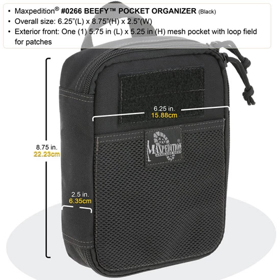Maxpedition beefed up the FATTY POCKET ORGANIZER for increased capacity. The Beefy Pocket Organizer is the largest of its kind with optimum interior space for standard flashlights, hand tools, large knives, 16OZ bottles, heavy cables and other fuller-sized gear. A full clamshell opening reveals a hefty main compartment, containing 15 elastic dividers and 2 large slip & zippered pockets. This portable utility carry is perfect for big jobs and can be dropped into your Maxpedition bag or attached to its exterior PALS webbing for extended travels.