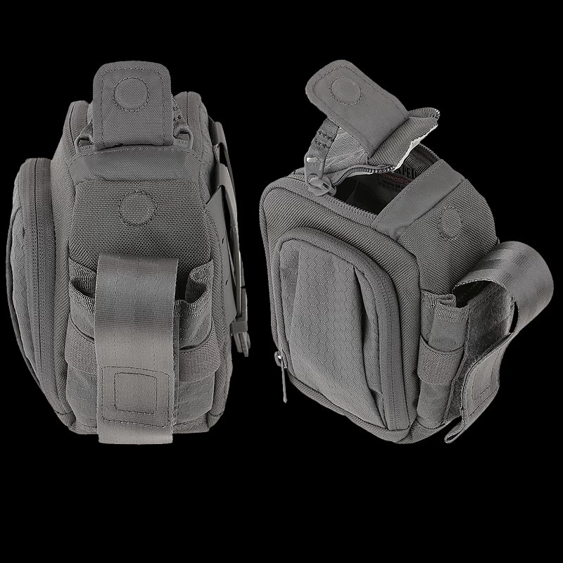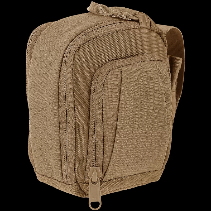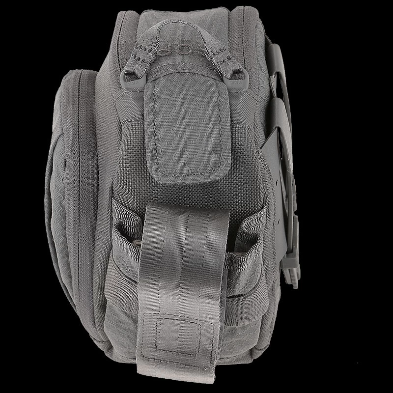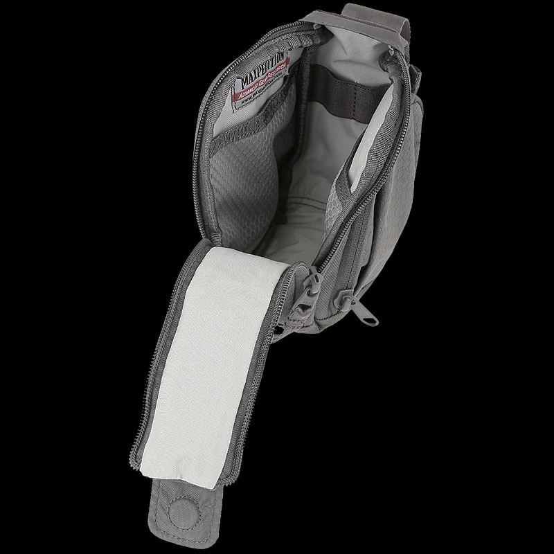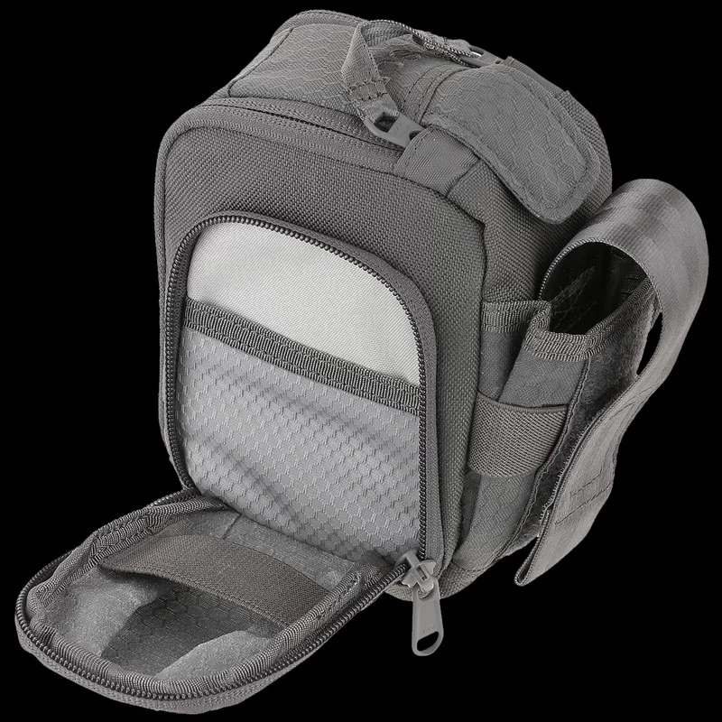 The Maxpedition Side Opening Pouch has a dual pull handle zippered main compartment, plus a magnetic closure for extra security of contents. There is a front compartment with elastic retention and a mesh sleeve pocket. A side pocket with an adjustable lid and elastic retention keeps contents secure. It has partial 3 mm padded foam for added protection, and the main compartment has mesh sleeves and elastic retention for organization. It comes with two matching TacTie® PJC3™ Ploymer Joining Clips for modular attachment to any MOLLE-compatible surface such as ATLAS™ or PALS.