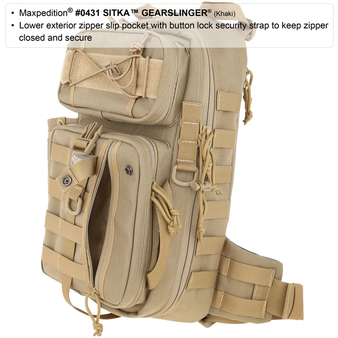 Single shoulder backpack designed to maximize utility when rotated towards front of body. Main compartment: 16.5 high x 8.5 wide x 3 thick with internal organization Top front: 7.5 wide x 4 high x 2 thick with internal organization Bottom front: 8 high x 7 high x 2 thick with internal organization Approximate Capacity: 618 cu. in. Main compartment and hydration compartment can accept CCW accessories Shoulder strap designed to go over left shoulder for better weapon shouldering Bag can be worn in front and contents comfortably accessed while sitting down Water bottle pocket sized to fit 32oz Nalgene bottle Compatible with 100oz hydration reservoir PALS modular webbing throughout to for attaching accessories Top and side handles