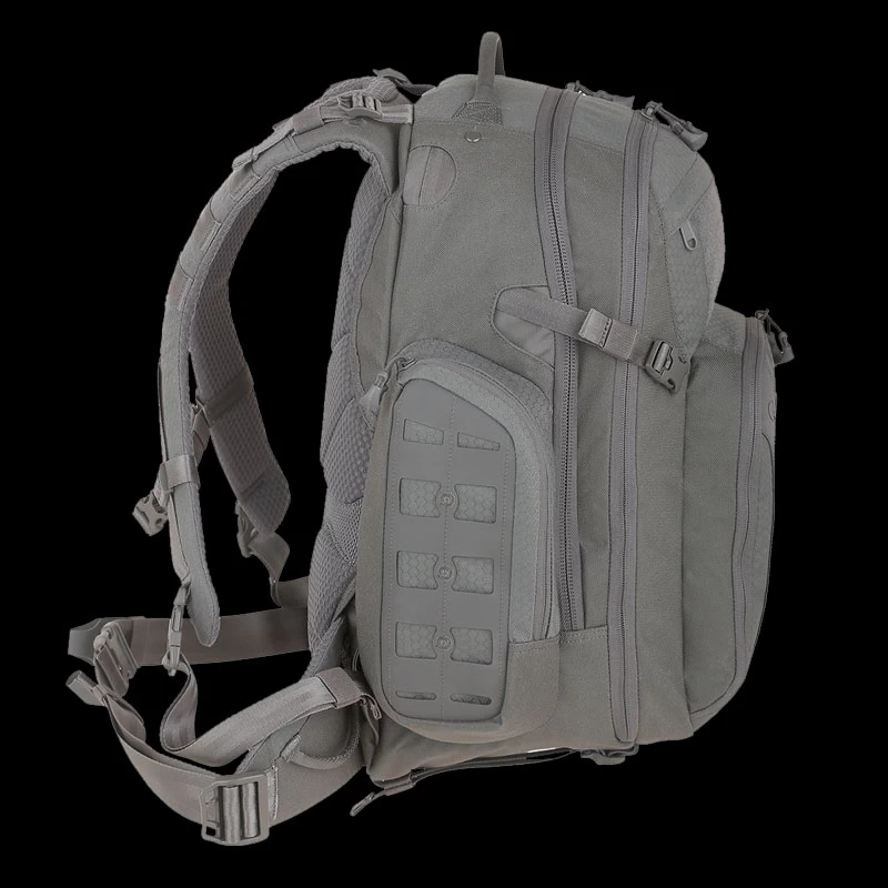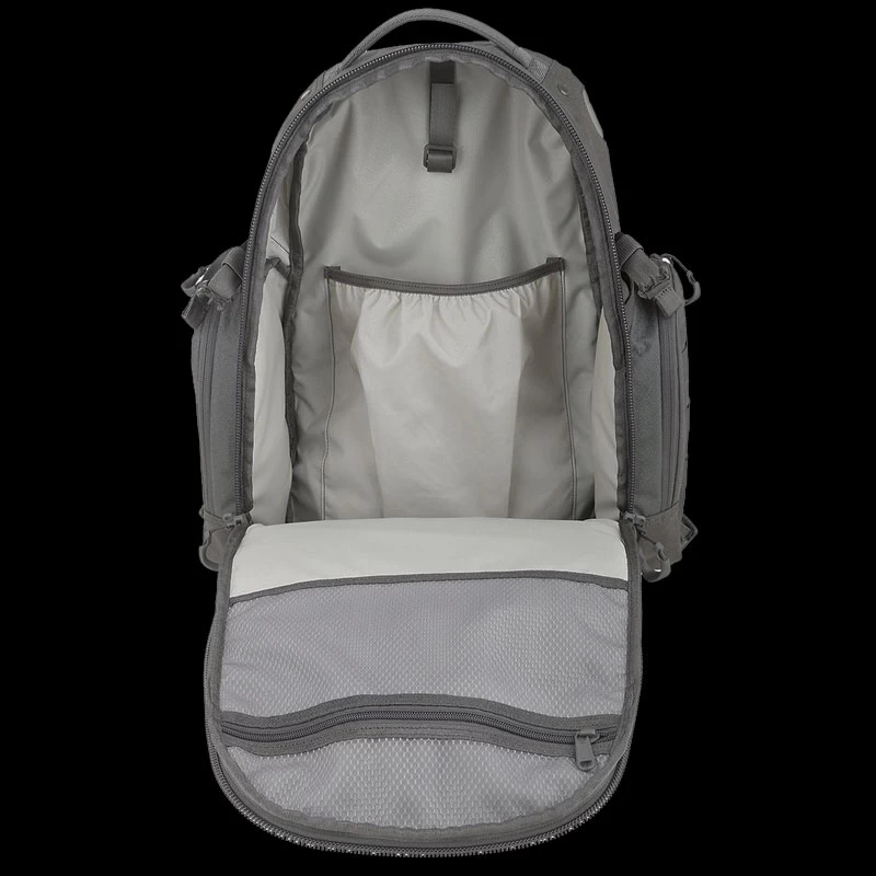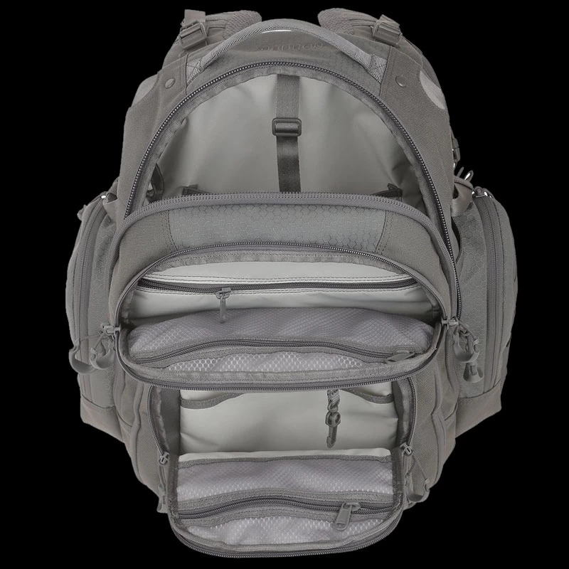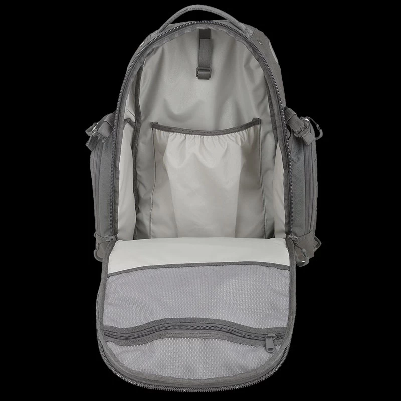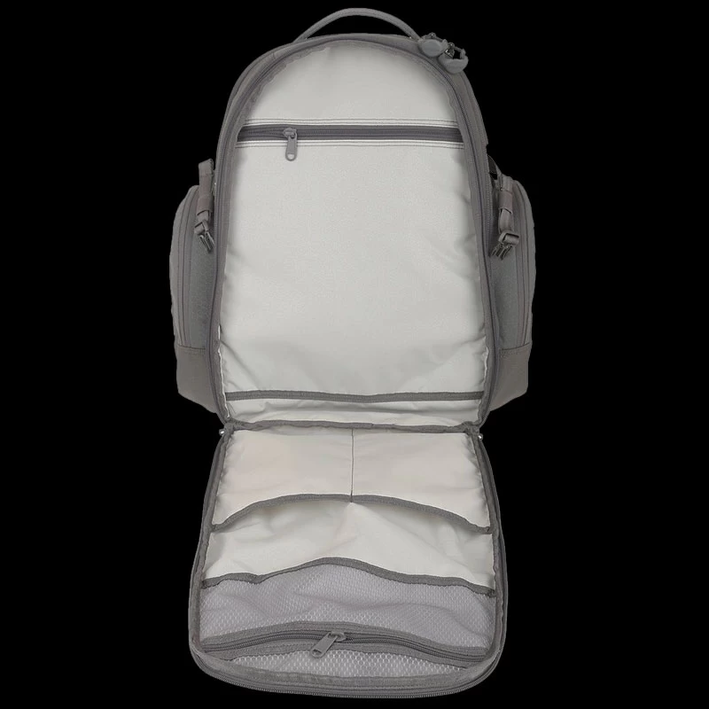 The Maxpedition Tiburon Backpack is an ergonomic pack with quick release yoke-style straps. There is a top zippered slip pocket with a loop field for patch adhesion, a front admin pocket for added organization, two zippered side pockets, a middle tech compartment, and a fully opening & lockable middle compartment. The middle tech compartment has a padded pocket sized to fit a 13″ laptop and most tablets. The main compartment has a hydration reservoir, and there are dual hydration tube ports.
