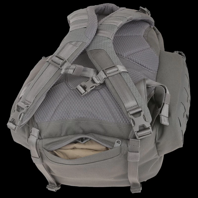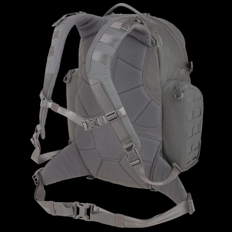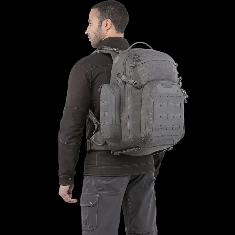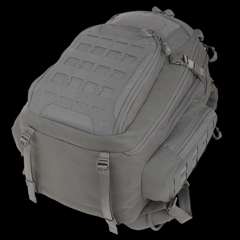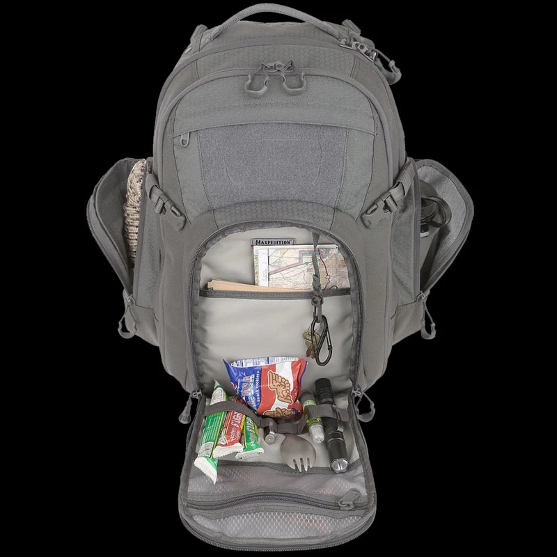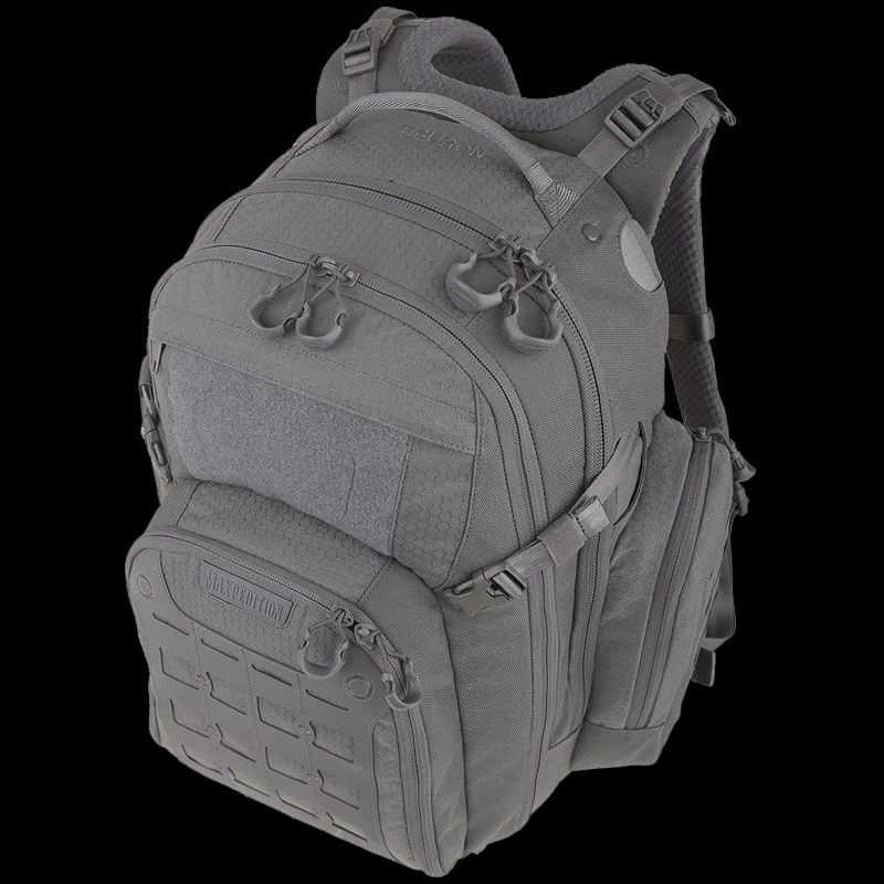 The Maxpedition Tiburon Backpack is an ergonomic pack with quick release yoke-style straps. There is a top zippered slip pocket with a loop field for patch adhesion, a front admin pocket for added organization, two zippered side pockets, a middle tech compartment, and a fully opening & lockable middle compartment. The middle tech compartment has a padded pocket sized to fit a 13″ laptop and most tablets. The main compartment has a hydration reservoir, and there are dual hydration tube ports.