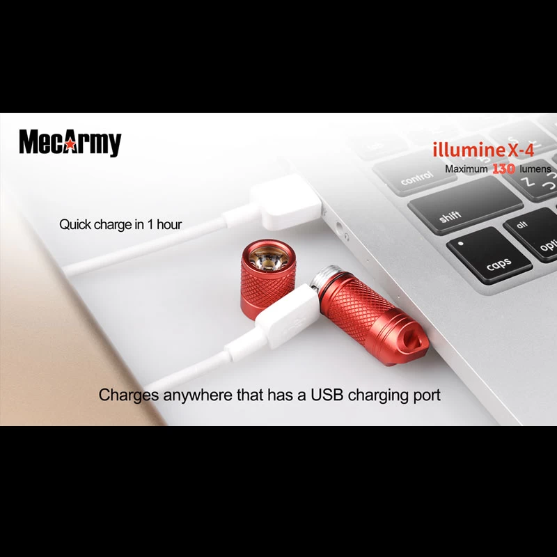 A huge 130 lumens in a tiny lamp, not much larger than your little finger! The MecArmy X4S is crafted from aluminium with a feeling of solidity in your hand. This tiny torch is just 41mm long – about the same size as the blade on your car key. It is activated by a twist of the head.