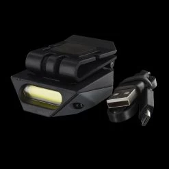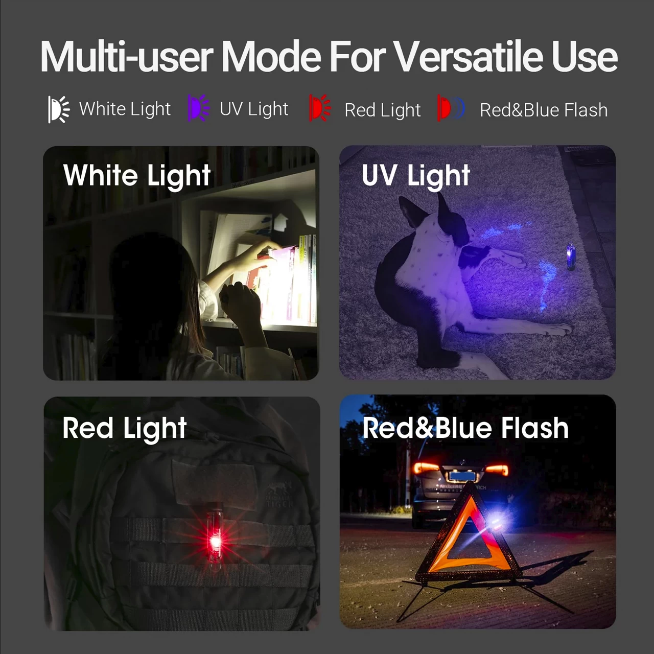 - Features three white-light brightness levels, strobe, and red, blue, and UV light beacon and flashing modes