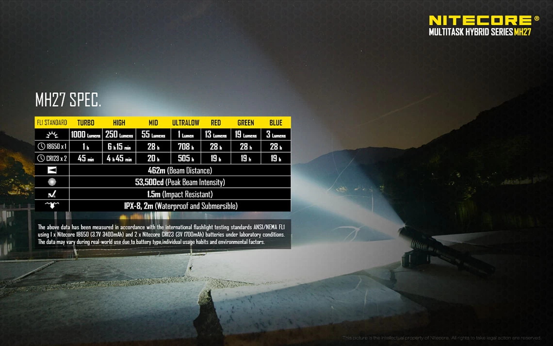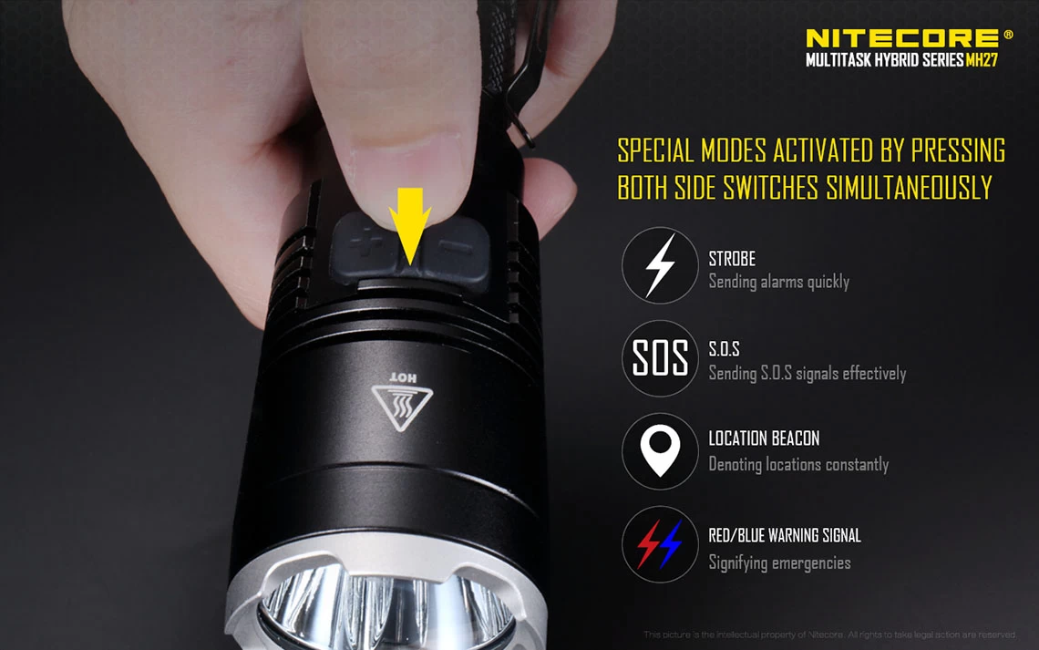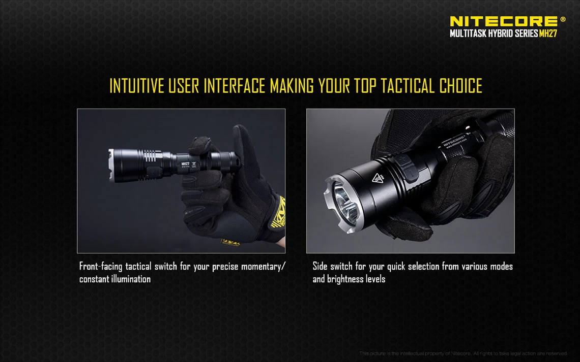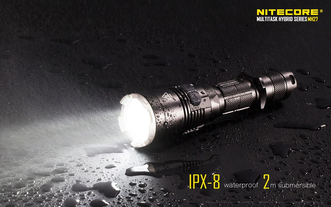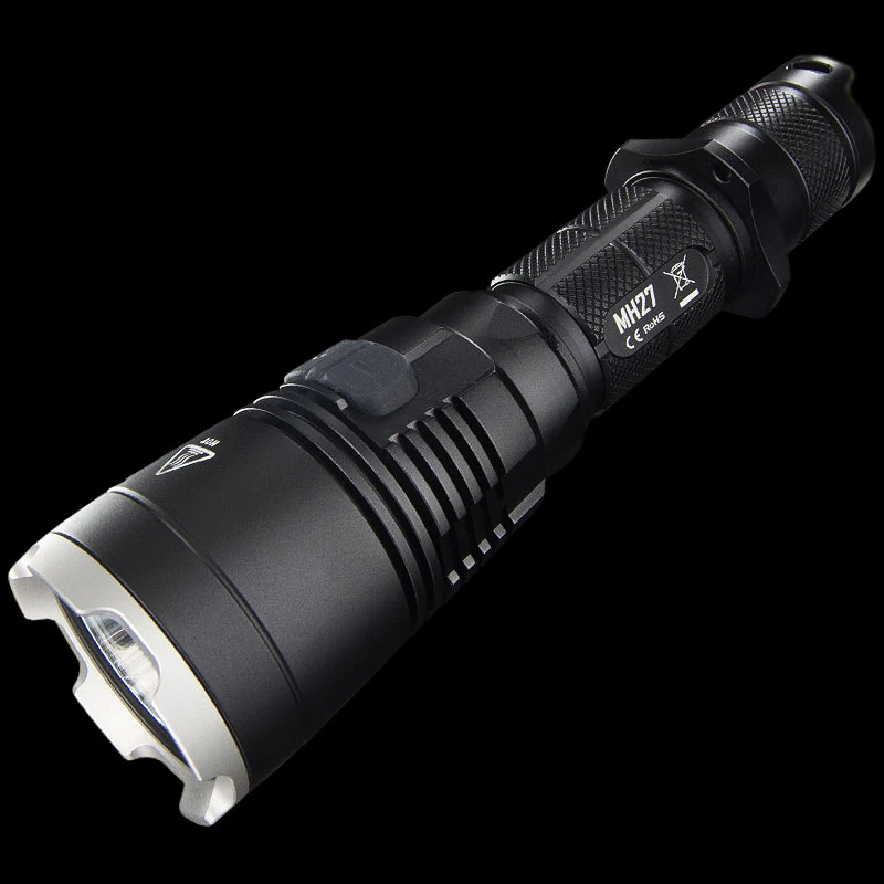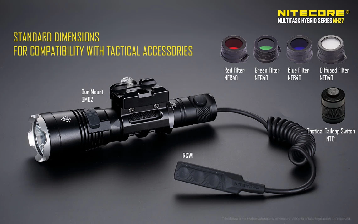 Other unique features include removable anti-rolling grip ring, reverse polarity protection (use with button top 18650 only), double spring anti-impact mechanism, which buffers recoil when mounted to a gun. The MH27 can be used in conjunction with the RSW1 remote pressure switch and GM02 gun mount. It also accepts all Nitecore 40mm filters and diffusers.