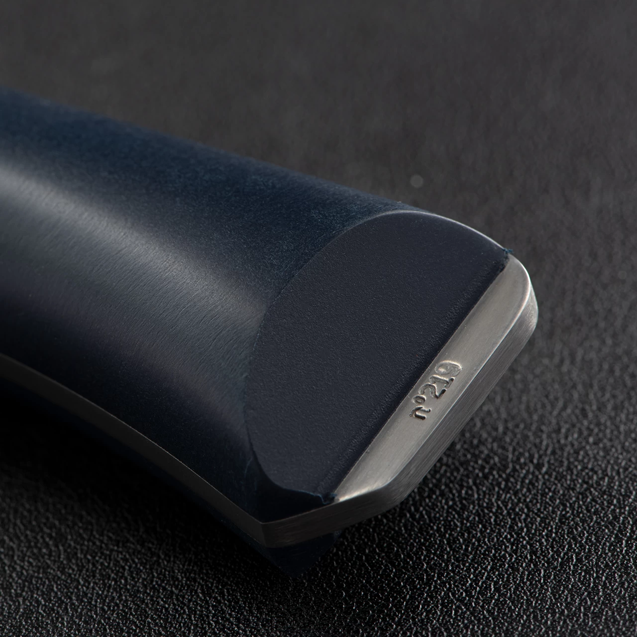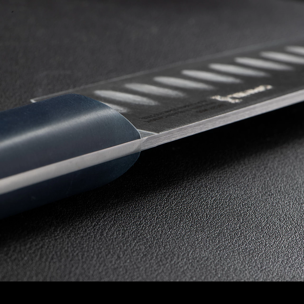 Rigid and stable for chopping herbs, onions or fruti and veg. It can cut with a rocking motion, but still have enough of a flat edge to push your ingredients off the chopping board. - Santoku 17cm