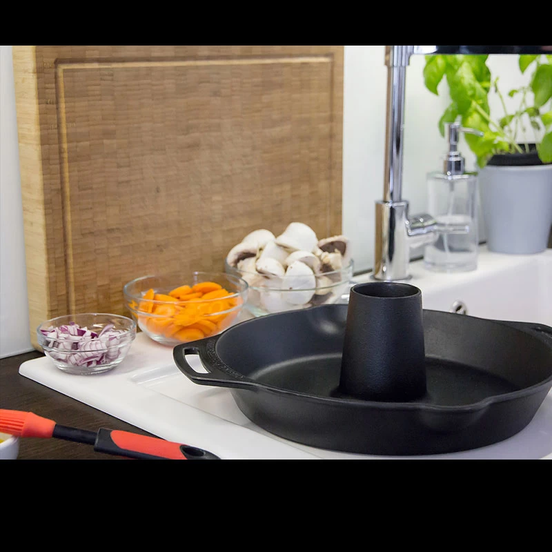 A chicken, quail or small duck will be prepared very easily with the Petromax Poultry Roaster CF30. Placed on the cast-iron roaster, the poultry will be evenly cooked thanks to the optimal heat distribution design. While the meat is sizzling in the oven or on the grill, surplus fat and meat juices will flow into the drip pan. The poultry will thus gain a delicious and crusty skin outside and thanks to the hole filled with spices, herbs and stock also a great flavour inside. It is a simple design perfectly suited to outdoor cooking. The valuable properties of the material, as well as the pre-seasoned surface (seasoned finish) together with the natural non-stick effect, round off the easy use of the cast-iron roaster