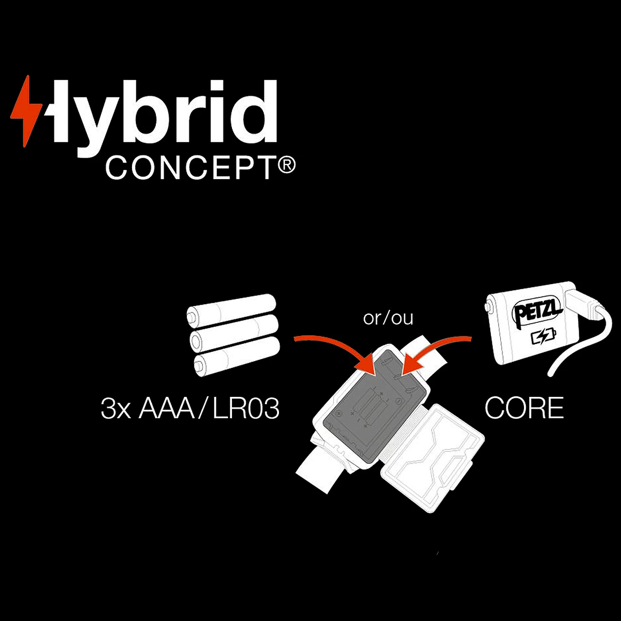 The headlamp has an integrated phosphorescent reflector that makes it easy to find in the darkness. Red lighting keeps you from blinding those around you and a reflective headband allows you to remain visible at night. Tikka Core is supplied with the Petzl Core rechargeable battery and also works with three standard AAA batteries, thanks to its Hybrid Concept design.