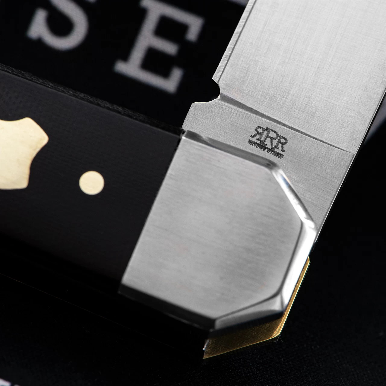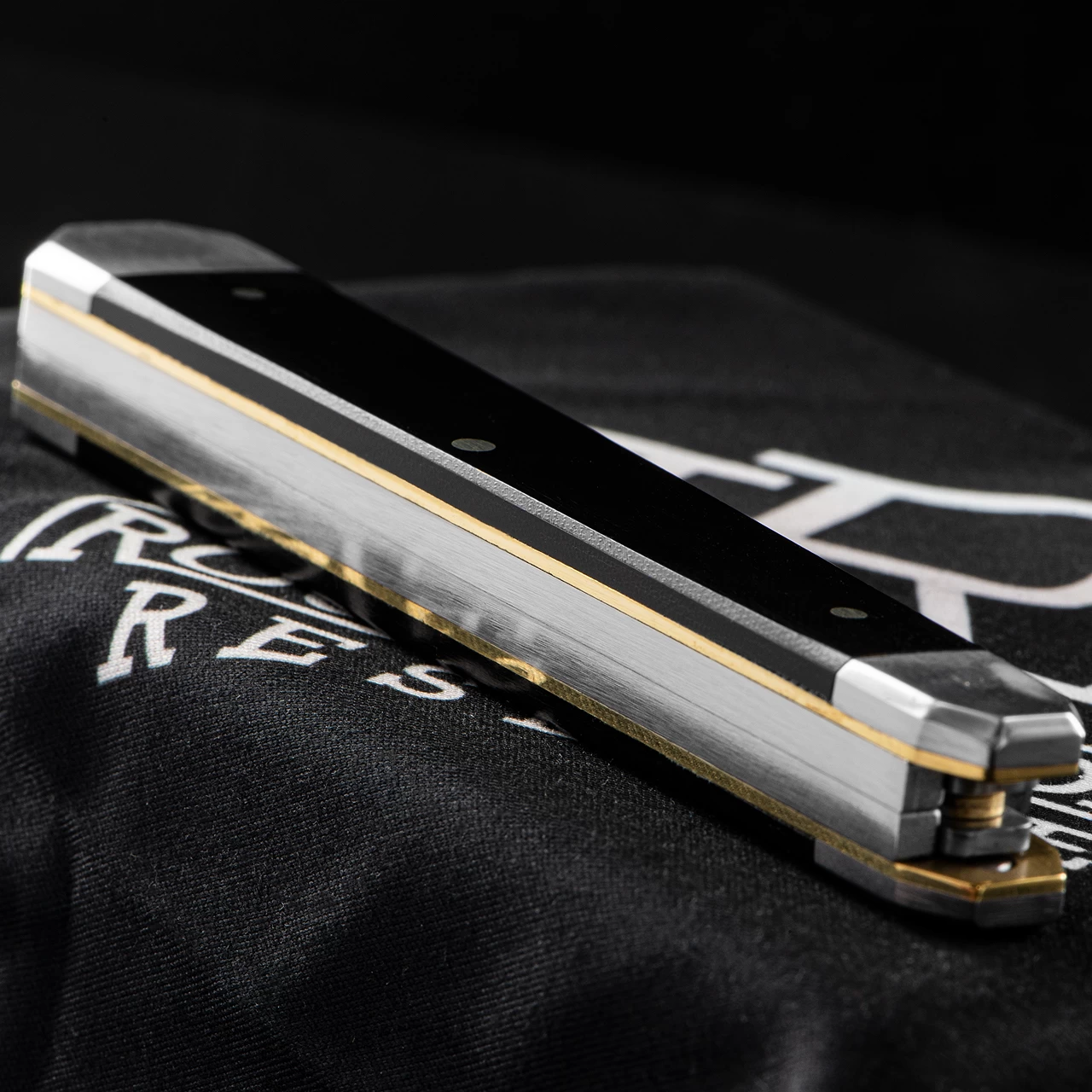 The handles are coffin-shaped black micarta with stainless steel bolsters, brass liners, and a nickel silver shield. It’s 11.4cm (4½”) closed and weighs 100g (3.4oz).