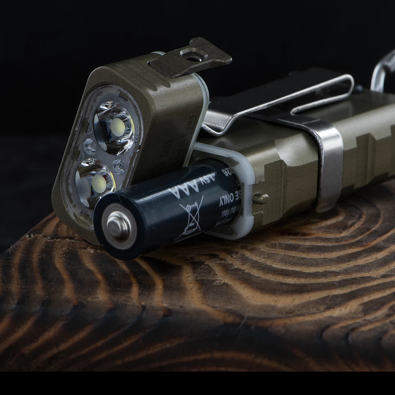 Open the light head to replace the AAA battery and lock it to use the external battery automatically. An indicator shows you which battery you are using and what charge is left!