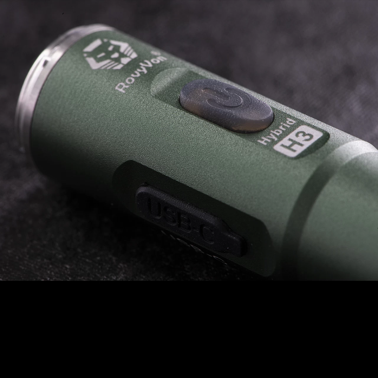 The Rovyvon H3 Hybrid Cree is supplied with a built-in 300mAh lipo battery that can be charged via the USB-C charging port, and it is also compatible with an AAA battery (1.5V Alkaline battery or rechargeable 1.2V NiMH battery) or rechargeable 10440 li-ion battery.