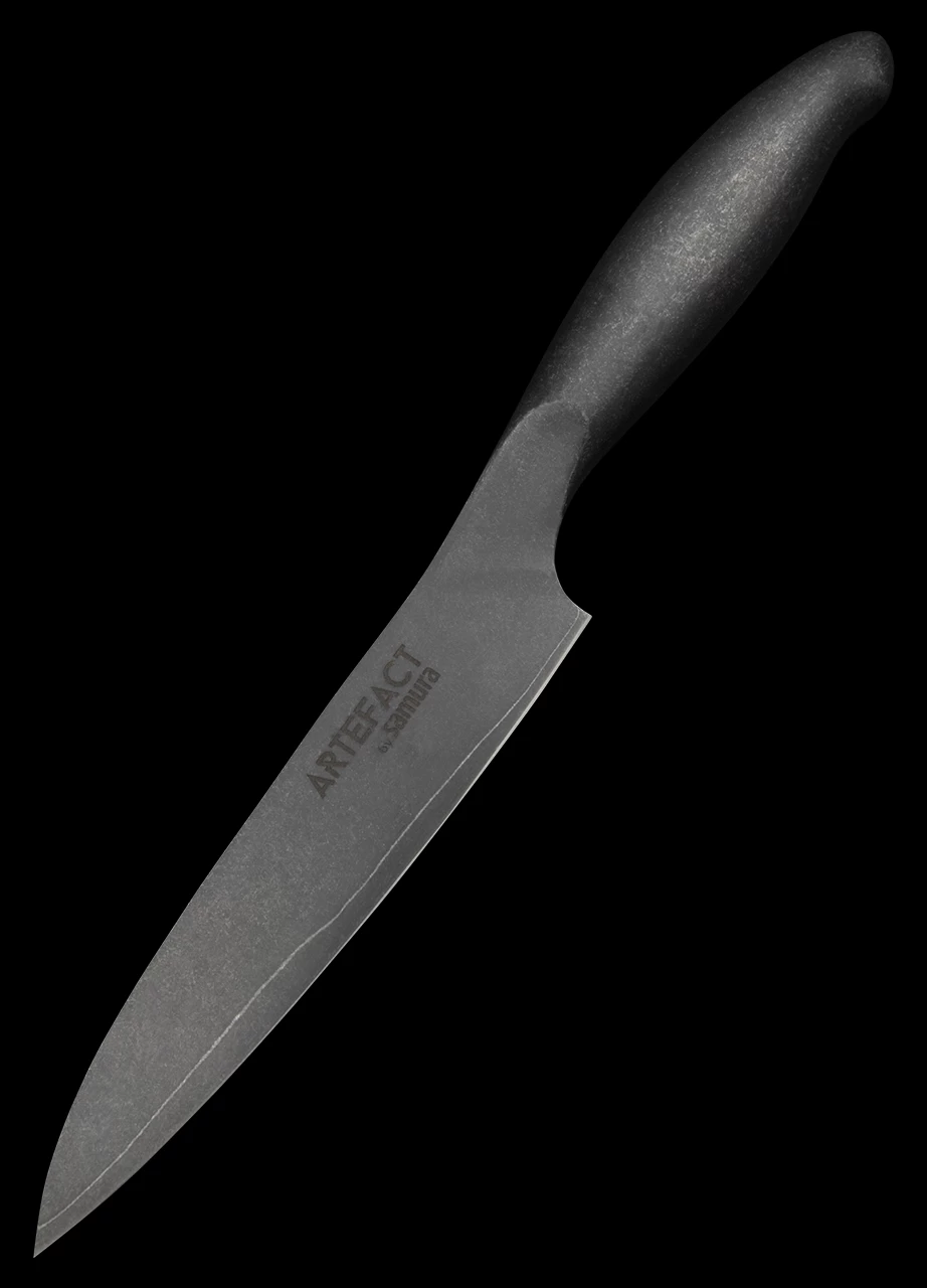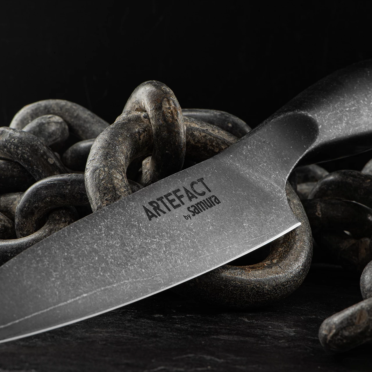 The Samura Artefact Series is an excellent choice for lovers of bold design and cooking enthusiasts who value style and performance in one package. The Large Utility knife features an all metal construction with a distinctive stonewash finish. The blade is AUS-10 Damascus steel whilst the hollow handle is stainless steel providing excellent balance and lightness of touch in use.
