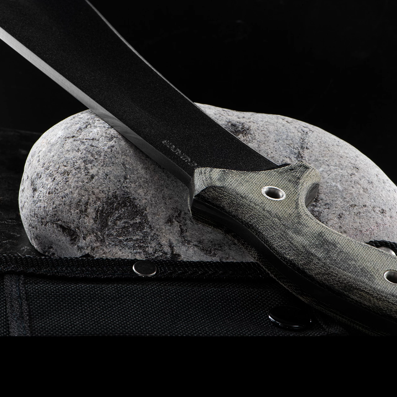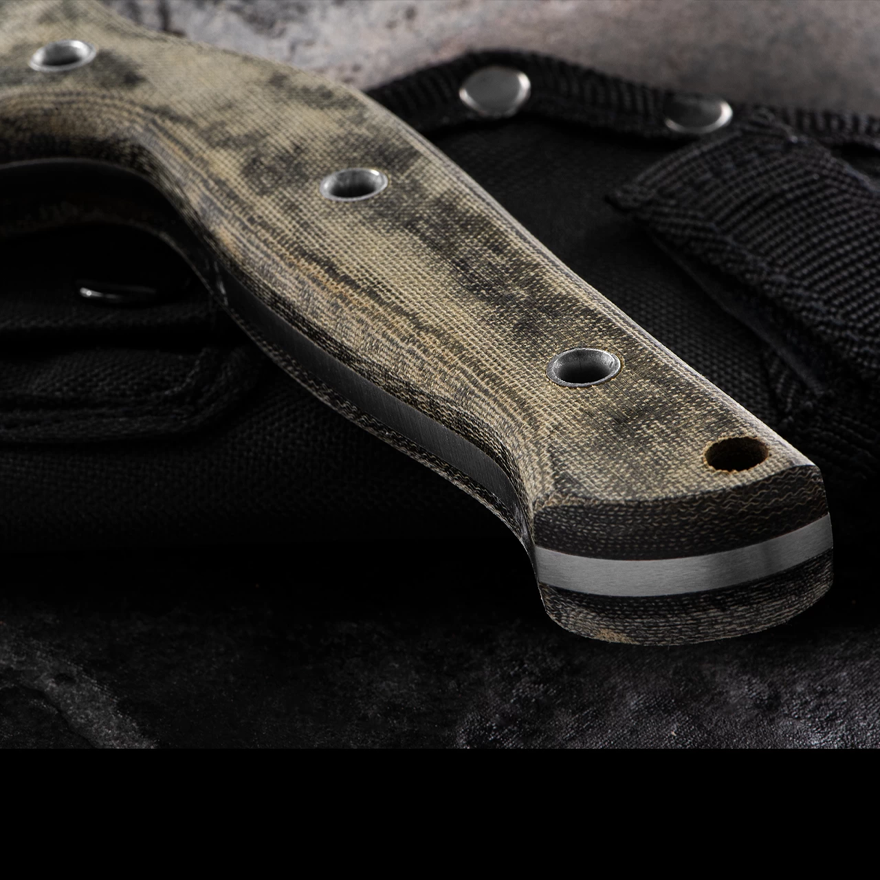 It has black Micarta handle scales with steel tube rivets and is exetremely comfortable in the hand and very nicely balanced. The recurved blade is 1075 steel with a black traction coating. It is supplied with a nylon sheath.Â