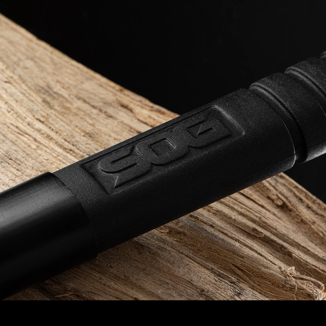 The 420 stainless steel head with a Hardcased black coating is mounted to the ballistic polymer handle with heavy-duty bolts and a steel ferrule to insure the strongest integrity. Side hammer checkering insures precision placement when swinging. Carried in a nylon sheath that can be mounted to belt, backpack, or gear. It is a universal tool for modern man.