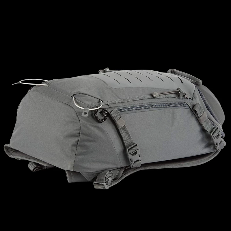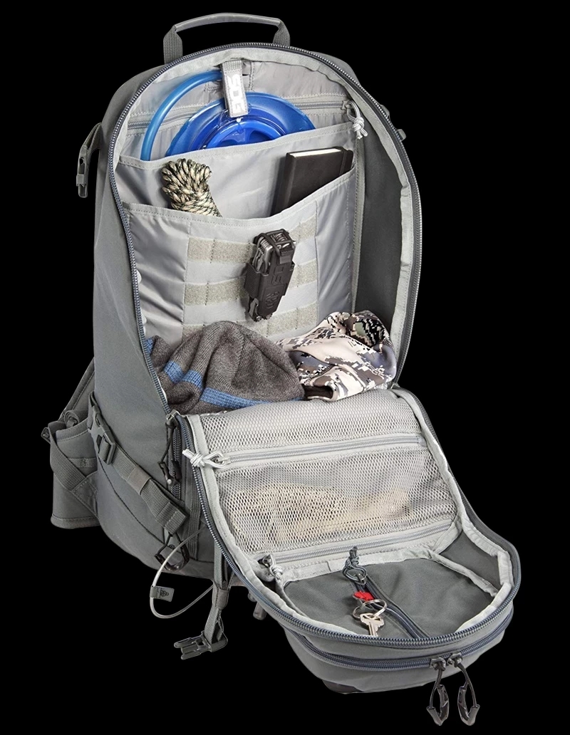 The panel loading main compartment utilizes every cubic inch with multiple interior pockets, padded laptop sleeve, hydration carry, and MOLLE loop field. Accessing the inside main compartment via the Quad-Zip means finding gear from the bottom of the pack doesn’t require unpacking everything on top of it. Any extra or bulky gear can be cinched on to the pack’s side compression straps, attached to the Hypalon MOLLE field, or held on by the Scout’s unique wire long item carry. The top molded panel allows quick access to smaller items due to the suspension, a fully loaded pack can be carried comfortably whether going for two miles or twenty miles.