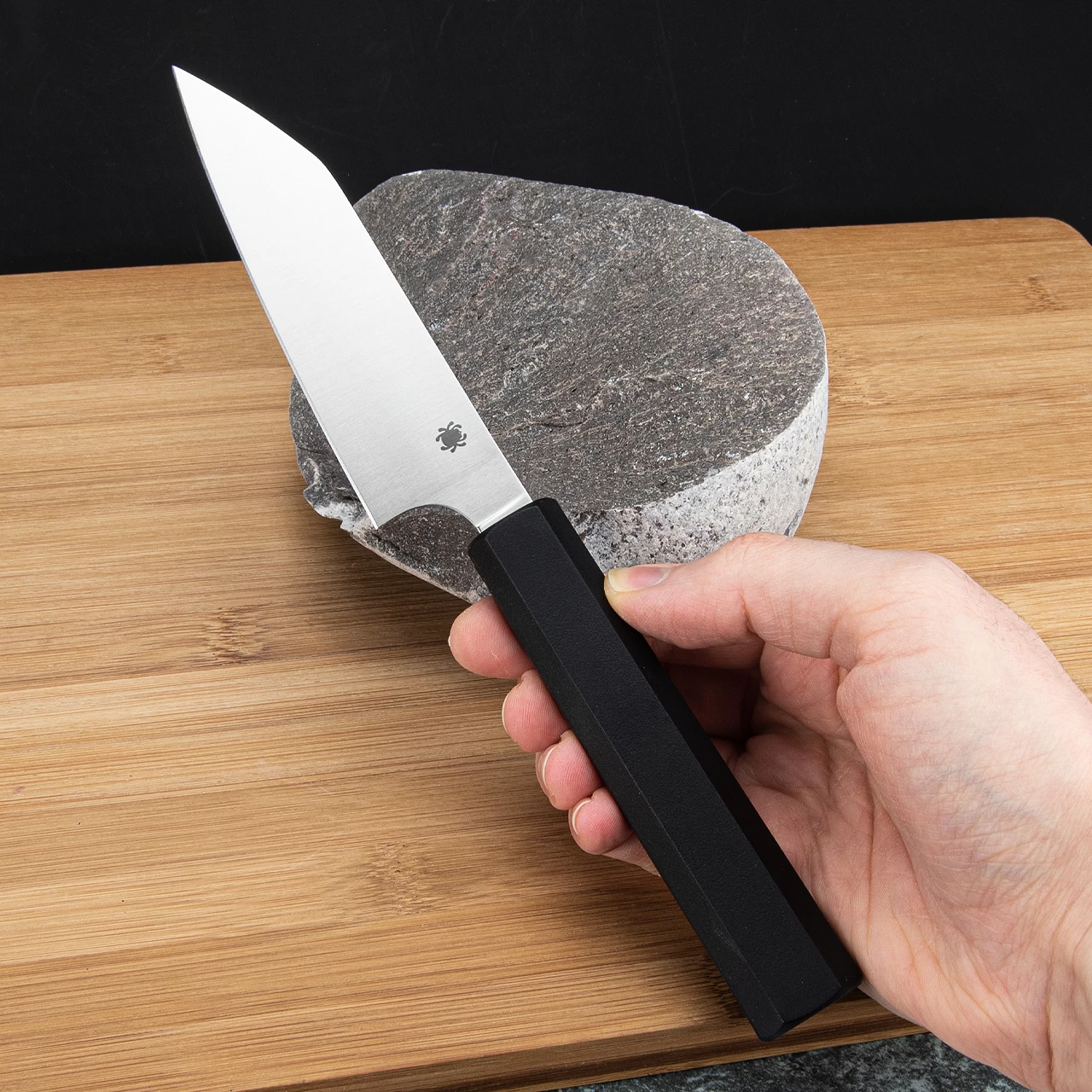 This is the Spyderco Carter Minarai Petty, from the French petit meaning small, this knife is the equivalent of a western paring knife and is ideal for peeling and slicing fruits and vegetables, making garnishes, and other detailed food-preparation tasks.