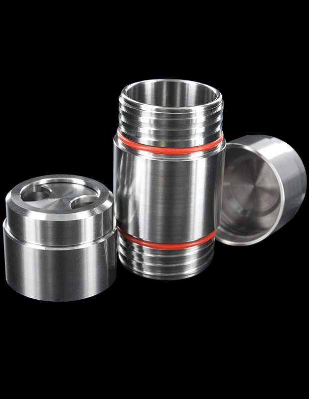 This symmetrical titanium tube is 3.5cm in length, 1.6cm internal diameter, 2.1 cm external diameter. The assembled capsule is 5cm in length, weighing 30grams. The thread is sealed at each end with a red o-ring. Each end cap contains an hourglass-shaped insert, which rotates, allowing this tube to be attached to a keyring.