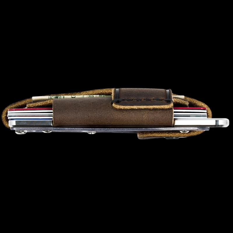 The top layer, holding the top-grain, full-tanned leather in place is subtly PVD coated, providing a dark contrast to the highlight of the machined steel. The colour supplied is decribed as “Mississippi Mud” – it’s a lovely, deep brown.
